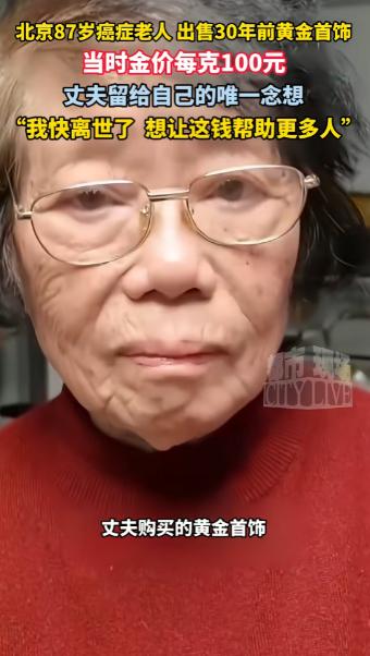 泪目!北京,一名87岁老奶奶癌症晚期,觉得自己状态不好,再加上近期金价高,就把30年前买的黄金拿出来准备卖掉,当初100元一克买的黄金,如今翻了整整10倍多,她表示虽然不舍,但想用这笔钱帮助到更多的人 北京一家正规黄金回收店里,87 岁的王奶奶攥着刚称重完的金饰,在工作人员伸手接过的瞬间,突然将首饰抱回怀中,紧紧贴在鼻尖反复亲吻,指尖还不住摩挲着戒指内侧的刻字。 那是老伴当年特意留下的两人名字缩写印记。 片刻后,她小心翼翼地把金饰递向工作人员,与这份珍藏多年的念想作最后的告别。 这两件金饰,是王奶奶与老伴最深的羁绊。 三十年前,老伴为了给相濡以沫的她一份纪念,攒了许久工资买下了这枚刻字戒指和一条细金项链(王奶奶回忆当时购入价约 100 元 / 克,据历史数据,1996 年国内足金零售价实际约 70-85 元 / 克)。 彼时日子并不宽裕,这份礼物也成了老伴送给她的珍贵心意。 老伴离世后,这两件金饰便成了王奶奶心底最珍贵的念想。 她用丝绒布袋将金饰层层裹好,放进首饰盒里细心收存,数十年里极少触碰,更不曾戴出门,唯有思念涌上心头时,才会打开盒子轻轻端详。 一场结肠癌晚期的重病诊断,打破了生活的平静,也让王奶奶对金饰的归宿,有了新的想法。 经过化疗治疗,王奶奶的身体状态大不如前,一个念头在她心里愈发坚定:把金饰卖了,换钱做公益,让这份念想化作温暖,照亮他人前路。 这个想法一说出口,立刻遭到了儿女们的反对。 儿女们反复劝说,老人的治疗费用他们会全权承担,金饰是父亲的遗物,留着才能有个念想。 可王奶奶态度异常坚定,她告诉儿女,与其让金饰在盒子里闲置,不如让它发挥更大的作用,这也是她与老伴共同的心意。 为了不让这份善意被回收市场的套路消耗,她特意让儿女帮忙筛选正规的回收渠道。 儿女们跑了好几家机构,逐一核对当日黄金回收价,确认没有隐性费用、价格合理后,才陪着母亲来到选定的回收店。 2026 年 1 月 24 日,工作人员当着一家人的面,一步步完成称重、用专业仪器检测纯度,全程公开透明,最终确认金饰总重 32 克,均为高纯度足金,回收价 1020 元 / 克,核算总价为 32640 元。 听到核算数字的那一刻,王奶奶的眼眶瞬间红了。 王奶奶早已和儿女商量好,意向将这笔变卖金饰的全部善款,用于资助山区女童完成学业或捐赠癌症康复机构(目前已联系公益机构,待公示后确认具体用途)。 在她心里,金饰的价值从不在价格高低,而在于它承载的对老伴跨越数十年的思念与爱意,如今把这份思念换成善意,就是让这份爱以另一种方式延续。 这份藏在金饰里的深情与善意,温柔又动人。 如果各位看官老爷们已经选择阅读了此文,麻烦您点一下关注,既方便您进行讨论和分享,又能带来不一样的参与感,感谢各位看官老爷们的支持!