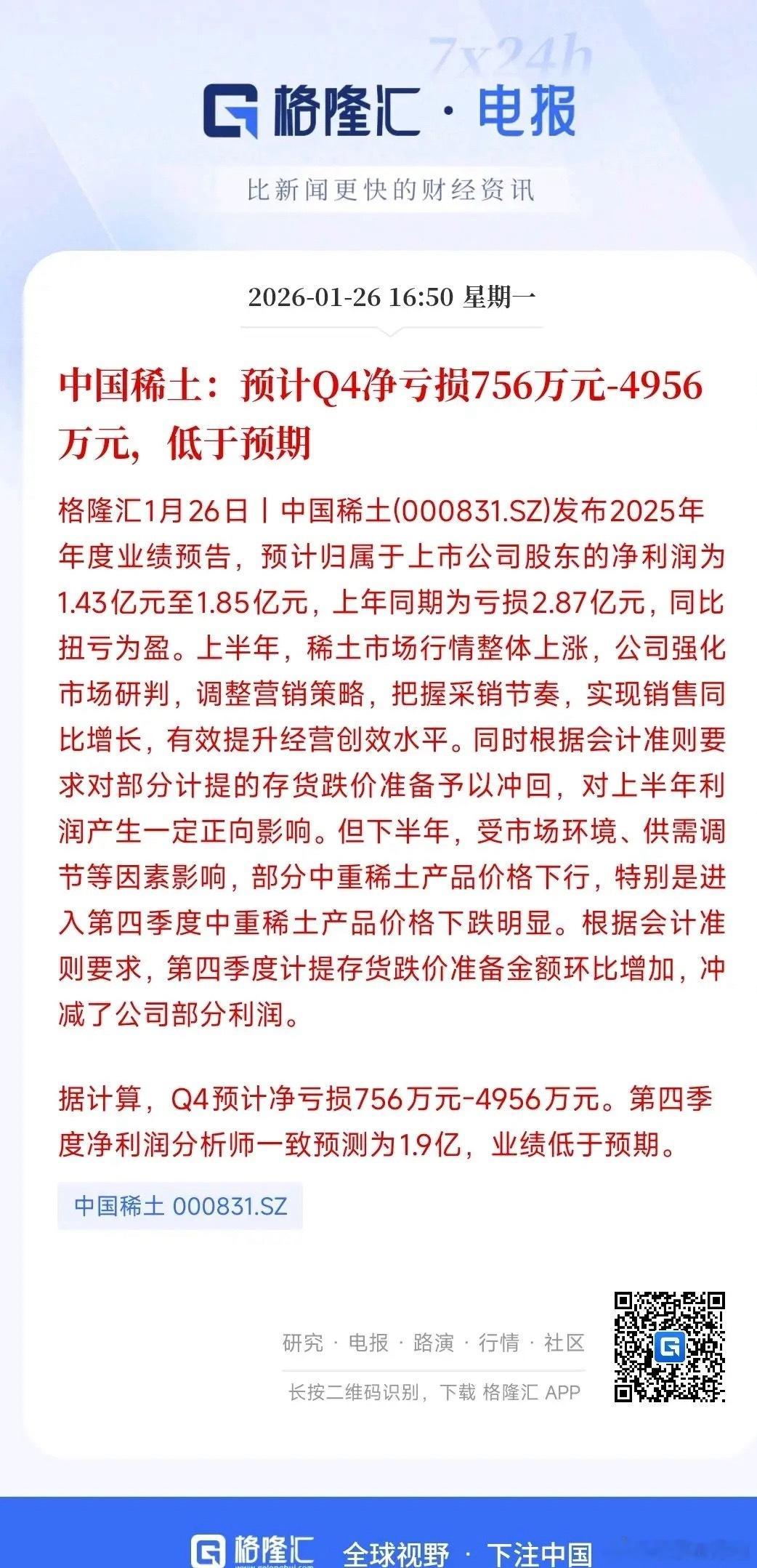 稀土龙头出现重大利空消息,业绩远远没有达到预期中国稀土公布了四季度业绩,远远没有达到预期,而且差的有点多,本来市场预期是利润1.9亿元,结果出现了重大亏损,两者相差了2亿元以上。稀土的四季度业绩不及预期主要就是中重稀土价格大跌导致的,这对于稀土板块都不是一个好消息,早期北方稀土四季度业绩符合市场的预期。中国稀土的业绩亏损可以说是完全是公司自己的问题明天中国稀土肯定会出现大幅度的波动,也会影响稀土整个板块,就看能不能拉回来了。