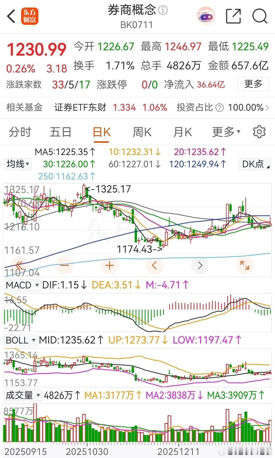券商概念板块今天冲高回落,收出了一根小阳线,并留下长长的上影线,涨幅为 0.26%,板块内个股大部分都是红盘报收。从今天的分时走势上看,券商概念板块还是延续了一贯的态势,冲高后就被砸了回来,之后就是横盘整理一整天。今天板块内涨幅最大的个股是财通证券,收盘时涨了4.3%,其次是兴业证券涨了3.2%;跌幅最大的个股是同花顺下跌了 2.78%。从走势上看,目前依然是在低位横盘整理!对于当前的券商概念板块来说,正处于估值底部与资金冷遇的尴尬时期。首先就是低估值特征显著:目前头部券商的PB处于历史低位,如中信证券(PB 1.47倍)、招商证券(PB 1.24倍),显著低于摩根大通(PB 2.58倍);其次就是散户持仓比较集中:目前筹码的分散导致上涨动能不足,资金更倾向于涌入科技题材股,形成“赚指数不赚钱”的分化行情。众所周知,当前导致证券板块难以上涨的一个重要原因就是政策调控压制了上涨冲动。一是被工具化定位:券商板块被用作指数“压舱石”,一旦快速拉升即遭国家队通过ETF抛压抑制,以维持“慢牛”节奏;二是监管干预加剧:提高融资保证金、限制游资炒作等措施间接压制了券商的弹性,部分投资者抱怨“冒头就被打”,也是正在上演的事情,今天早上开盘前证券日报发表的关于抑制题材炒作的文章,相必很多人都看见了吧!