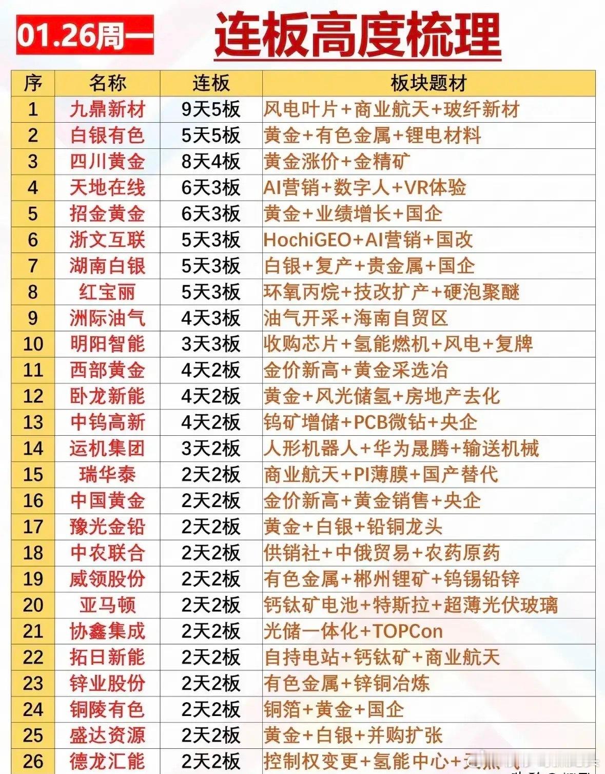 今日(1.26)涨停连板梯队梳理!今日连板股呈现出鲜明的结构性特征,黄金、有色金属板块成为资金追捧的绝对主线,多只标的走出高连板行情,反映市场在避险需求与通胀预期下对贵金属的强烈关注;同时风电、商业航天、AI营销等题材也表现活跃,叠加国企改革、资产重组等事件驱动,个股连板动力充足,整体市场情绪偏暖,但需警惕题材轮动过快带来的波动风险。个股数据分析1. 九鼎新材:9天5板,属风电叶片+商业航天+玻纤新材板块,受益于风电装机需求增长与商业航天产业升温,玻纤新材料技术壁垒较高,资金关注度持续提升,连板动力较强。2. 白银有色:5天5板,覆盖黄金+有色金属+锂电材料题材,依托矿产资源储备与锂电材料布局,受益于贵金属涨价与新能源需求增长,资金抢筹意愿强烈。3. 四川黄金:8天4板,聚焦黄金涨价+金精矿题材,旗下金矿资源储量丰富,金价上行周期下业绩弹性凸显,叠加市场避险情绪升温,连板走势稳健。4. 天地在线:6天3板,主打AI营销+数字人+VR体验,依托技术优势布局元宇宙场景,AI营销需求爆发带动业务增长,题材热度与资金共振推升连板。5. 招金黄金:6天3板,属黄金+业绩增长+国企概念,作为区域黄金龙头,业绩增长确定性较强,国企背景叠加金价上行,成为资金避险布局核心标的。6. 浙文互联:5天3板,覆盖HochiGEO+AI营销+国改题材,AI营销业务布局领先,国改预期叠加技术迭代,驱动业绩与估值双升,资金关注度较高。7. 湖南白银:5天3板,属白银+复产+贵金属+国企概念,复产进度超预期,白银价格上行带动盈利修复,国企背景强化资金信任度,连板动力充足。8. 红宝丽:5天3板,主打环氧丙烷+技改扩产+硬泡聚醚,技改扩产释放产能,环氧丙烷需求回暖带动营收增长,下游应用场景拓展支撑连板走势。9. 洲际油气:4天3板,属油气开采+海南自贸区题材,受益于国际油价波动与海南自贸政策红利,油气资源储备丰富,资金对能源安全主题关注度提升。10. 明阳智能:3天3板,覆盖收购芯片+氢能燃机+风电+复牌,复牌叠加资产收购利好,氢能与风电业务协同发展,技术优势凸显,资金追捧度较高。11. 西部黄金:4天2板,属金价新高+黄金采选冶题材,黄金采选产能稳定,金价创历史新高带动业绩弹性释放,避险需求下资金持续布局。12. 卧龙新能源:4天2板,主打黄金+风光储氢+房地产去化,多元化布局新能源与贵金属业务,房地产去化缓解资金压力,业务协同提升估值。13. 中钨高新:4天2板,属钨矿增储+PCB微钻+央企概念,钨矿资源增储强化原料优势,PCB微钻技术领先,央企背景叠加行业复苏,连板动力较强。14. 运机集团:3天2板,覆盖人形机器人+华为晟腾+输送机械,与华为合作拓展智能输送设备,人形机器人题材催化下,技术突破带动估值提升。15. 瑞华泰:2天2板,属商业航天+PI薄膜+国产替代题材,PI薄膜技术国内领先,商业航天产业爆发带动需求增长,国产替代逻辑强化资金信心。16. 中国黄金:2天2板,主打金价新高+黄金销售+央企概念,作为央企背景的黄金零售龙头,金价上行带动终端销量增长,品牌优势凸显。17. 豫光金铅:2天2板,属黄金+白银+铅铜龙头,铅铜冶炼技术成熟,贵金属涨价带动盈利修复,业务多元化降低周期波动风险。18. 中农联合:2天2板,覆盖供销社+中俄贸易+农药原药,供销社背景叠加中俄贸易增量,农药原药需求稳定,政策红利驱动估值修复。19. 威领股份:2天2板,属有色金属+郴州锂矿+钨锡铅锌,锂矿资源储备丰富,钨锡铅锌价格上行带动业绩增长,资源优势强化连板逻辑。20. 亚马顿:2天2板,主打钙钛矿电池+特斯拉+超薄光伏玻璃,钙钛矿技术突破带动光伏玻璃需求增长,特斯拉订单支撑业绩,题材热度较高。21. 协鑫集成:2天2板,属光储一体化+TOPCon题材,TOPCon电池技术领先,光储一体化布局契合能源转型趋势,政策红利驱动业务扩张。22. 拓日新能:2天2板,覆盖自持电站+钙钛矿+商业航天,自持电站现金流稳定,钙钛矿与商业航天题材催化,技术迭代提升增长空间。23. 锌业股份:2天2板,属有色金属+锌铜冶炼,锌铜产能规模较大,有色金属价格上行带动盈利修复,行业集中度提升强化竞争优势。总结今日连板股行情中,黄金、有色金属板块成为绝对主线,体现市场避险情绪与通胀预期的共振;风电、商业航天、AI营销等题材同步活跃,叠加国企改革、资产重组等事件驱动,个股连板动力充足。整体来看,市场情绪偏暖,但题材轮动较快,需关注高连板股的获利回吐风险,同时留意业绩确定性强、逻辑清晰的标的。