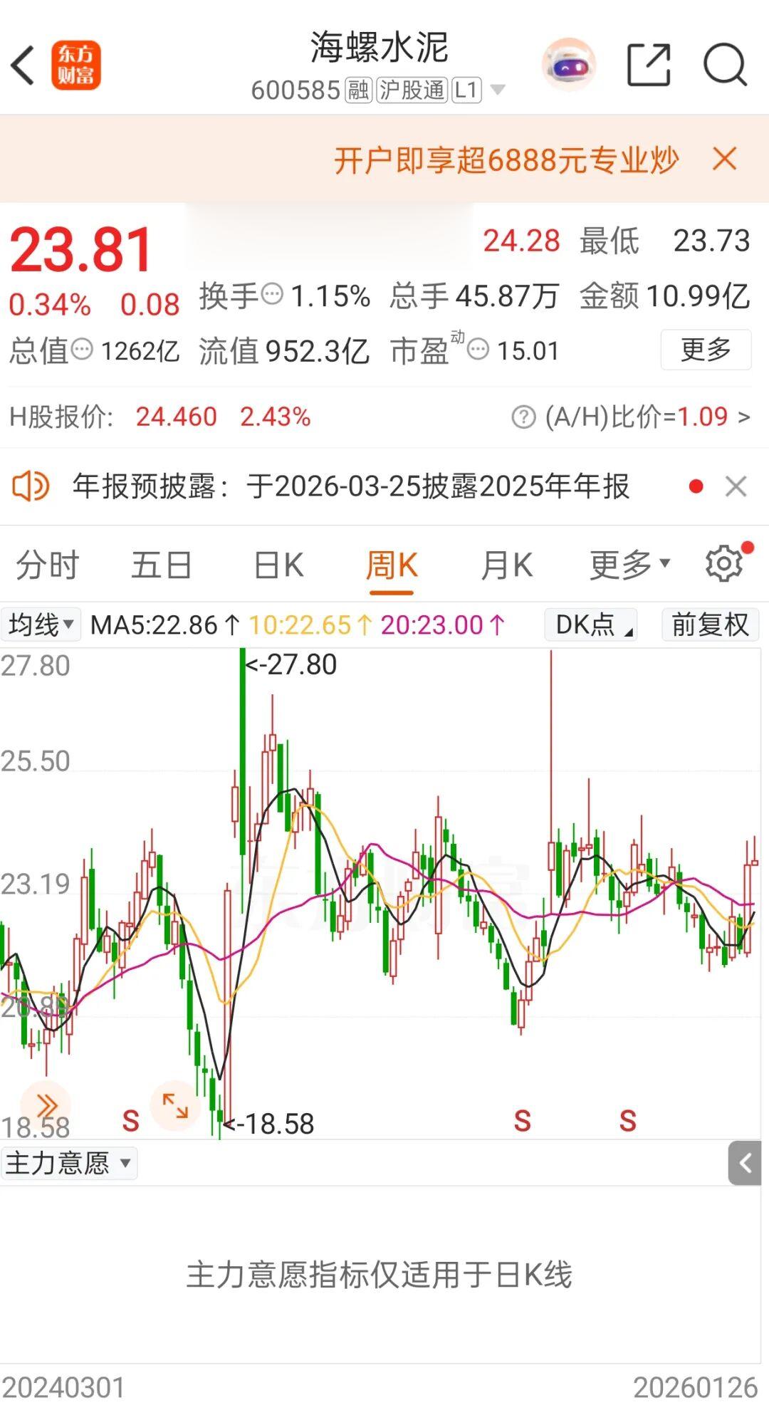 截至1月26日收盘,海螺水泥A股报23.81元/股,最新市值为1262亿元。