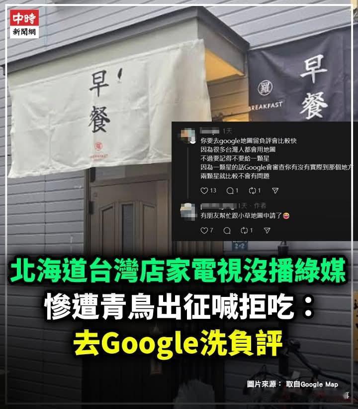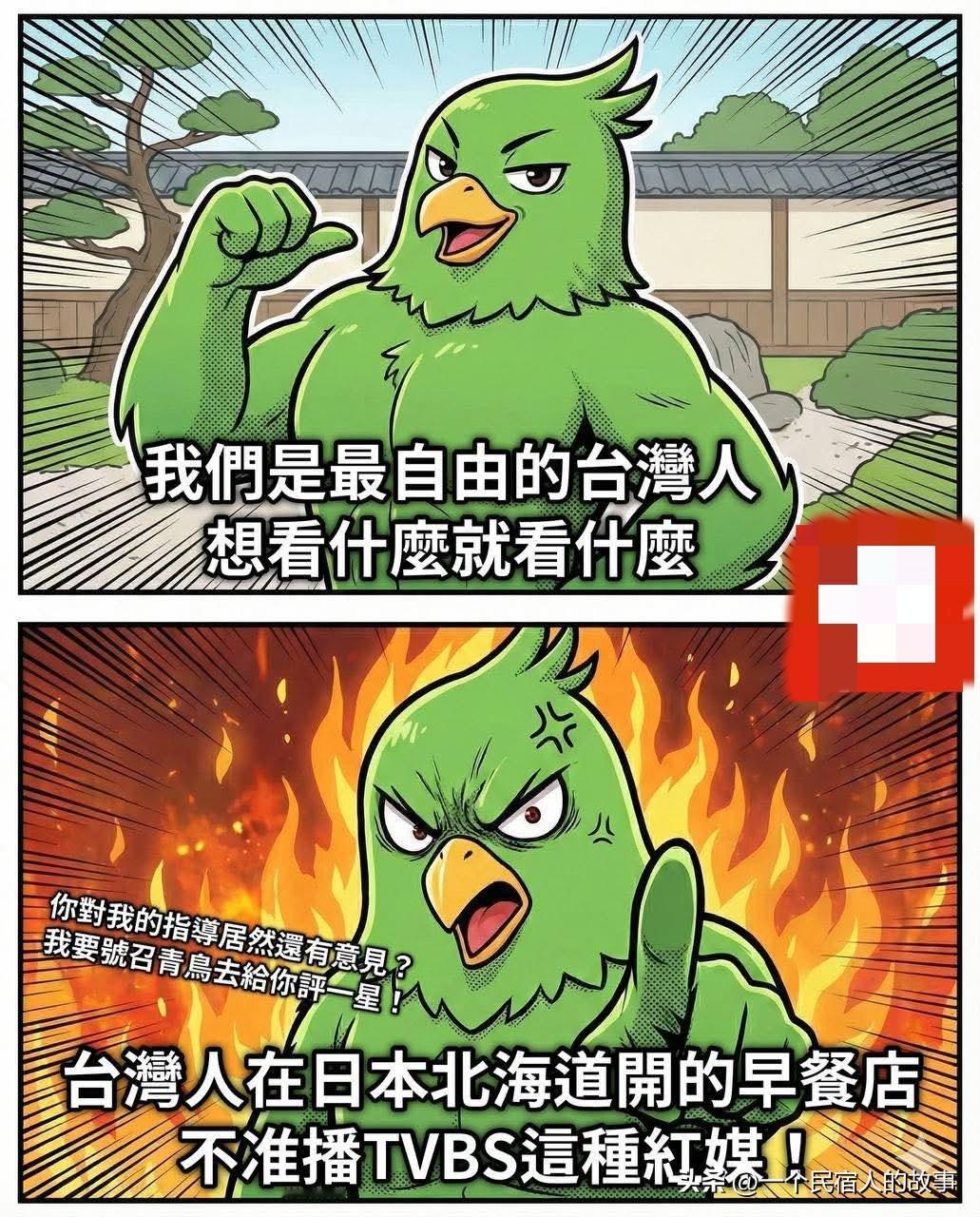 日本北海道一早餐店因电视播放TVBS频道遭青鸟出征怒刷一星! 现在岛内绿营青鸟犹