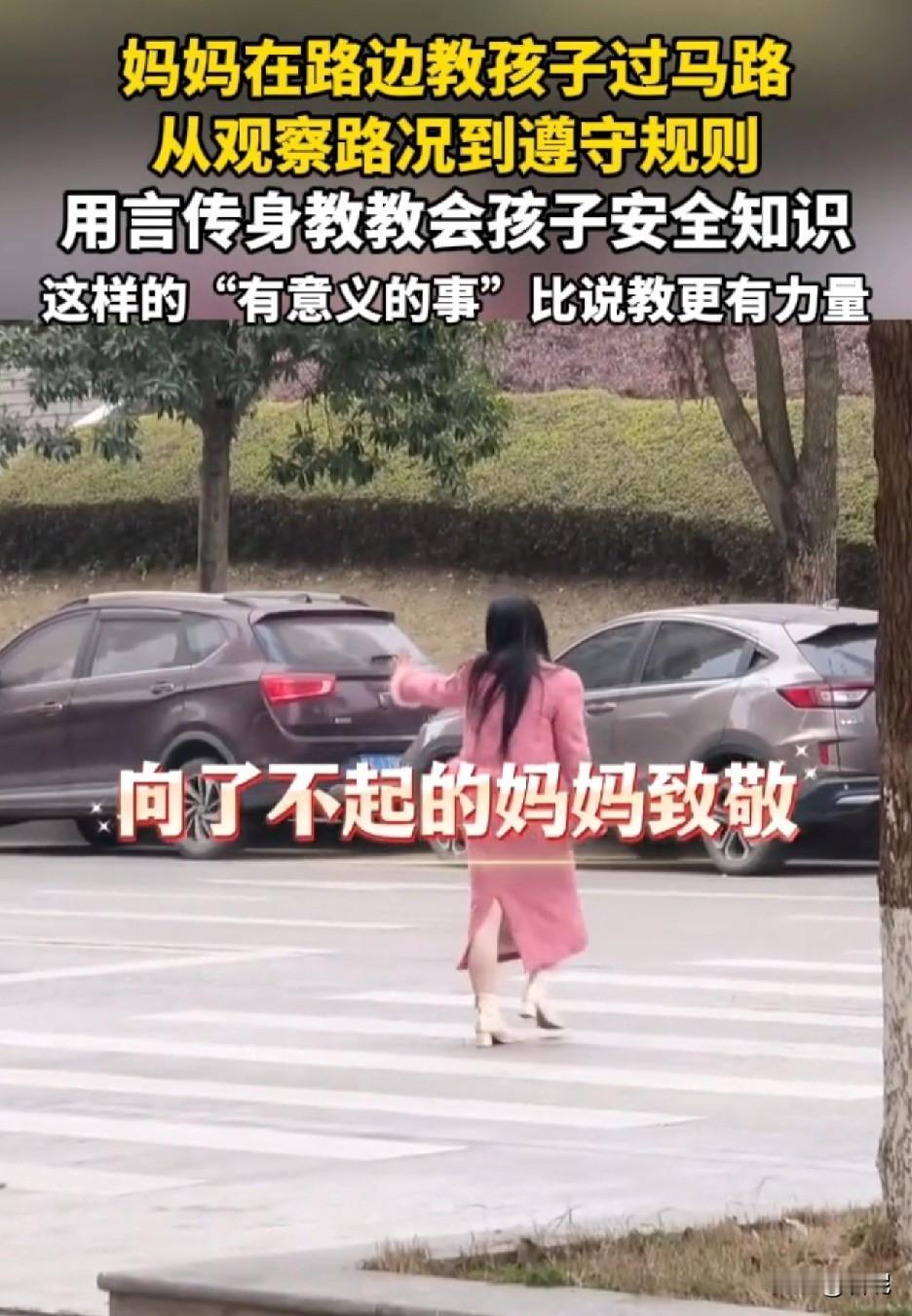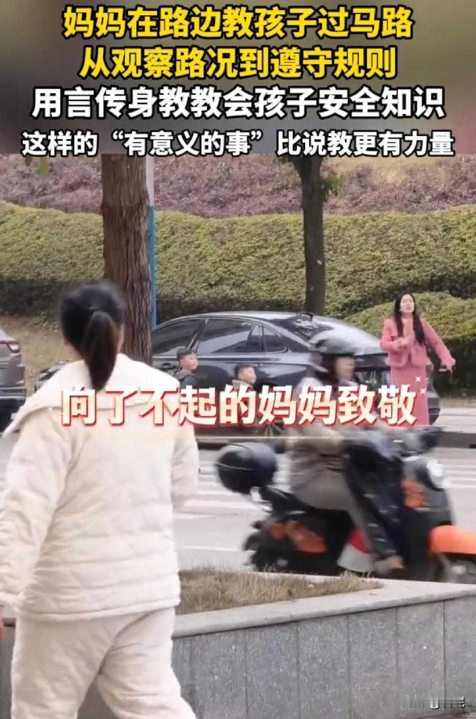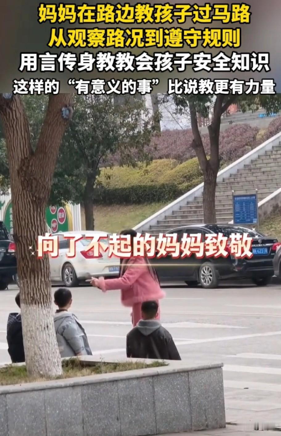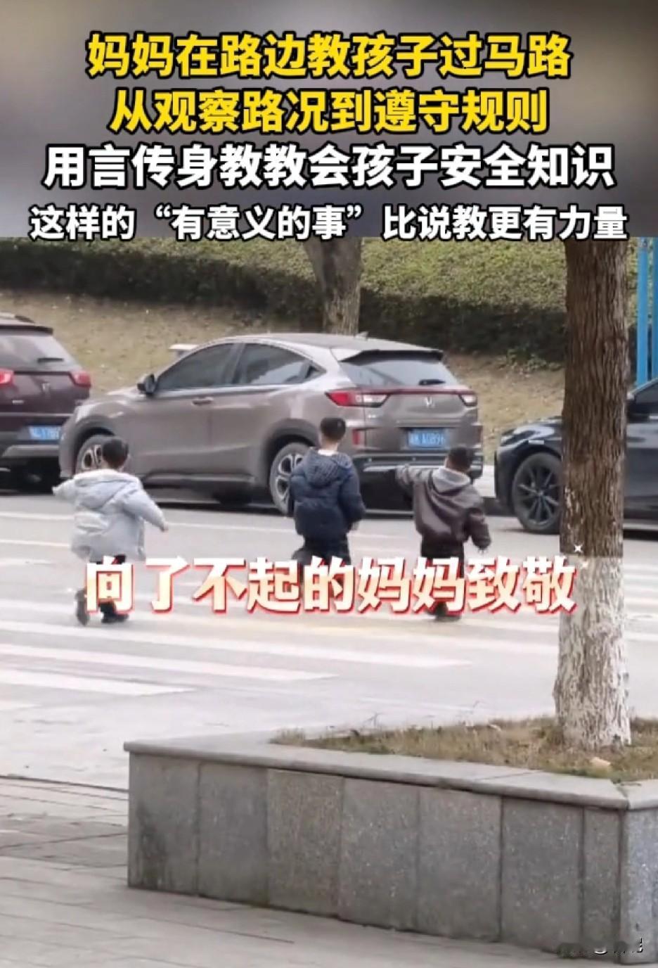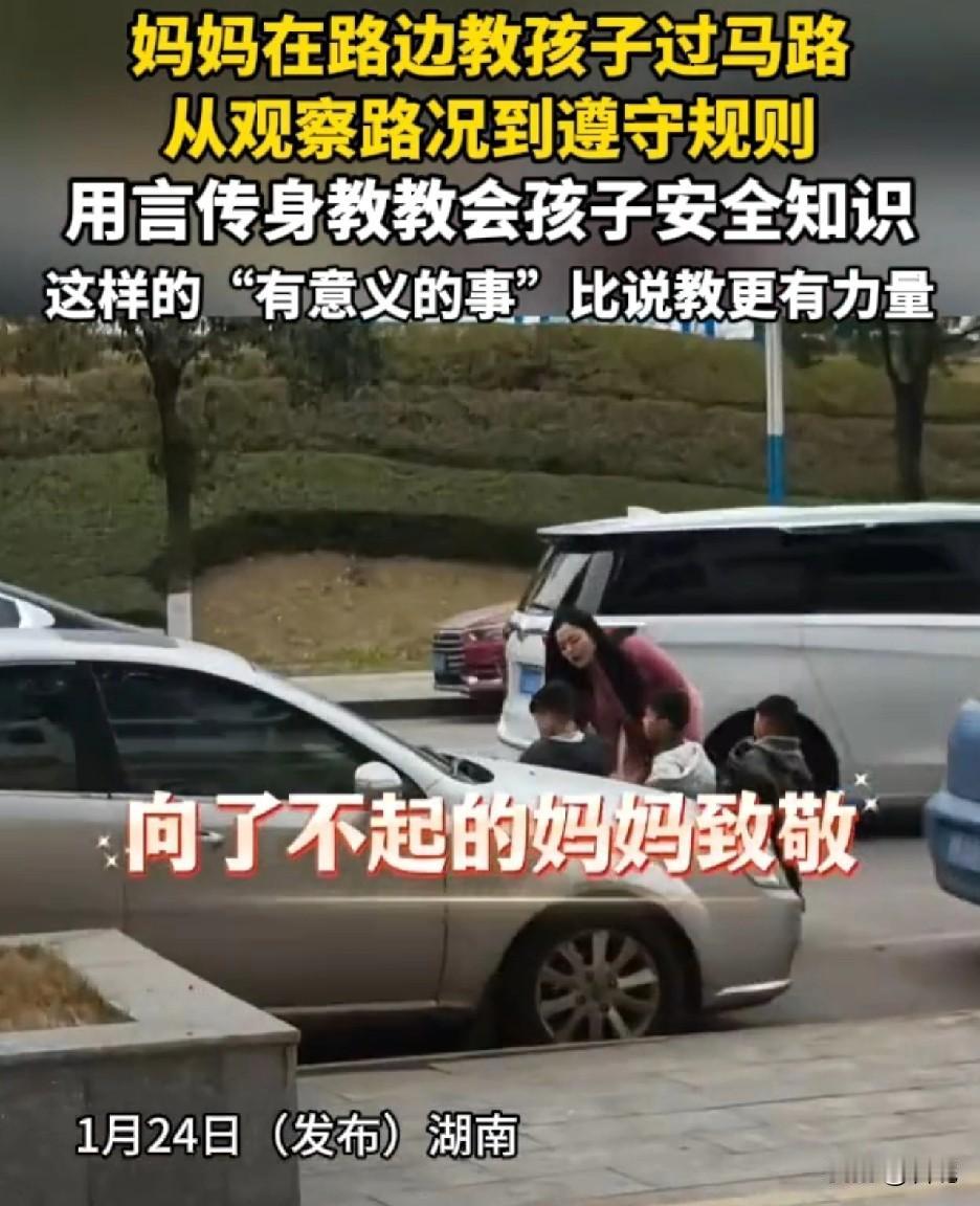 向了不起的妈妈致敬! 湖南一妈妈在路边教三个孩子过马路,从观察路况到遵守交通规则,一一讲解后,自己示范一次,然后让孩子们学一次。 这种带着孩子一起观察、讲解言传身教的方式,才是真正的安全教育,比起单纯的喊叫“别乱跑”更有意义,也更有力量。 从小就培养安全意识,为这个母亲点个大大的赞! 只是孩子还太小,身高高度不够,就怕有的司机不好好开车,视觉盲区的存在,所以还是需要大人陪同。