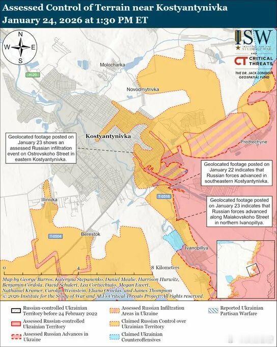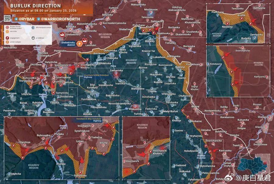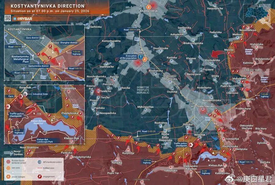 俄军占据康城市中心,沃尔昌斯克一路向南!1月25日,在康斯坦丁诺夫卡方向,“南方”集团军的部队集群在多个区域持续展开攻势,包括城内和城南地区,连续攻克多个要点。在康斯坦丁诺夫卡城内,俄突击部队正在向市中心区推进,此前,N-32(T-0504)公路东南侧的农舍区域已被肃清。由于乌军兵力现在龟缩在据点内,非常密集,因此俄军的推进并不是特别顺利。虽然,乌军增援部队在遭受了俄无人机操作员的袭击下遭遇重大损失,乌军仍利用恶劣天气掩护扩大了兵力部署。在克列班-比克水库区域,俄军控制区正在向南翼扩展,已经完全拿下该区域,占领水库北岸和大部分景观公园。水库北部地区只有极小一块阵地由乌军控制,其他区域则成为俄军超小型部队的集结地。为了缓解这里的局势,乌军从这里向伊万诺波尔和普列谢耶夫卡方向发起突袭,以迟缓俄军的进攻。在通往别列斯特卡的路上,俄军部队从“GAI哨所”支援点发起进攻,攻入村庄西南部的一处小型工业区。在亚布洛诺夫卡以北,乌军被击退至公路后方;但在公路以南,乌军仍依托庞大的工事顽抗,并得到无人机补给的支持。美国战争研究所也更新了地图,确认了俄军DRG已经深入康城市中心。和红军城类似,随着乌军在城区被分割包围,溃败只是时间问题。在俄乌北部边界的沃尔昌斯克附近,“北方”集团军的部队继续向布尔卢克方向推进。在斯塔里察地区,俄军突击部队沿河岸向伊兹比察方向推进,并肃清了沃尔恰河北岸附近森林的另一部分。在沃尔昌斯克附近,乌军继续被驱逐出林带,此前,乌军零星部署于此,时刻试图闯入市区以示存在。俄军攻势在沃尔昌斯克的棚屋区继续进行,占领了该定居点西郊的农场,并向北部的居民区推进。在杰格佳尔诺耶地区,局势保持不变。有报道称,俄军向涅斯捷尔诺耶方向推进,这与乌克兰部队对周边林带的袭击有关,俄军侦察部队可能部署在这些林带上。在德武列昌斯基-卡缅卡一线,过去几周,俄军部队已推进约六公里,并占领了科洛杰兹诺耶居民点附近几处林带。