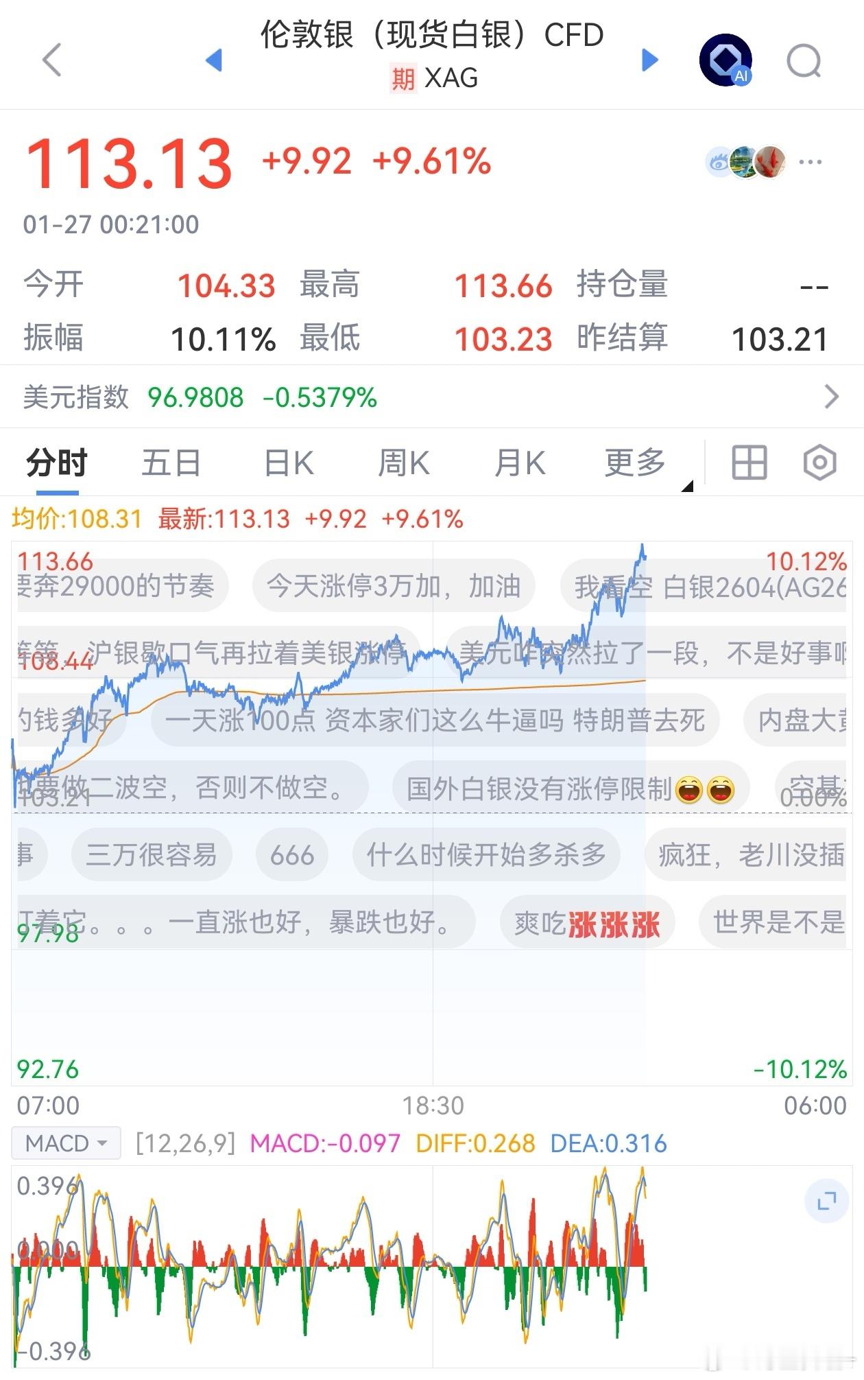 沪银 白银在突破市场预期的100美元目标价位后继续强劲上涨,日内涨幅接近10%,现报113美元,单日上涨达10美元。国投白银LOF将暂停申购