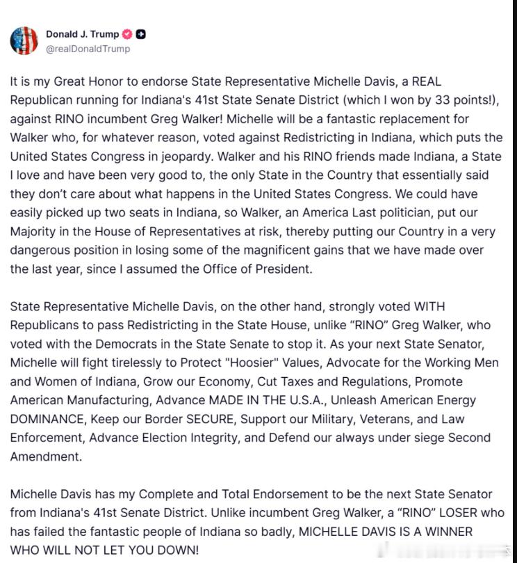 【黄金时代】川普正在党内初选中挑战反对重新划分选区的印第安纳州共和党参议员格雷格·沃克。“米歇尔·戴维斯,一位真正的共和党人,正在竞选印第安纳州第41选区州参议员(我曾以33个百分点的优势赢得该选区!)”“米歇尔将完美地取代沃克。不知出于何种原因,沃克投票反对印第安纳州重新划分选区,这让美国国会陷入了危险之中。沃克和他的共和党同僚们让印第安纳州——一个我深爱并一直善待的州——成为全国唯一一个实际上对美国国会漠不关心的州。我们本可以轻松地在印第安纳州赢得两个席位,但沃克,这位“美国至上”的政客,却让我们在众议院的多数席位岌岌可危,从而使我们的国家陷入了非常危险的境地,有可能失去我上任总统以来在过去一年里取得的一些辉煌成就。”美国和欧洲当代史川普主义研究热点现场海外新鲜事