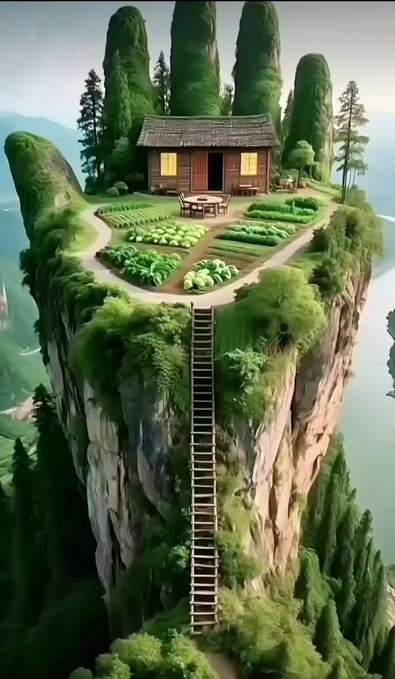 掌心桃源 这方孤峰如巨掌托举尘世烟火,木屋静立掌心,菜园里新绿蓬勃。垂落的木梯似掌纹,接引着山外的风。晨雾漫过指尖,山风掠过檐角,在这只天然的绿色手掌之上,日子慢成了诗,三餐烟火与云海山雾作伴,每一口呼吸都是与世隔绝的温柔。