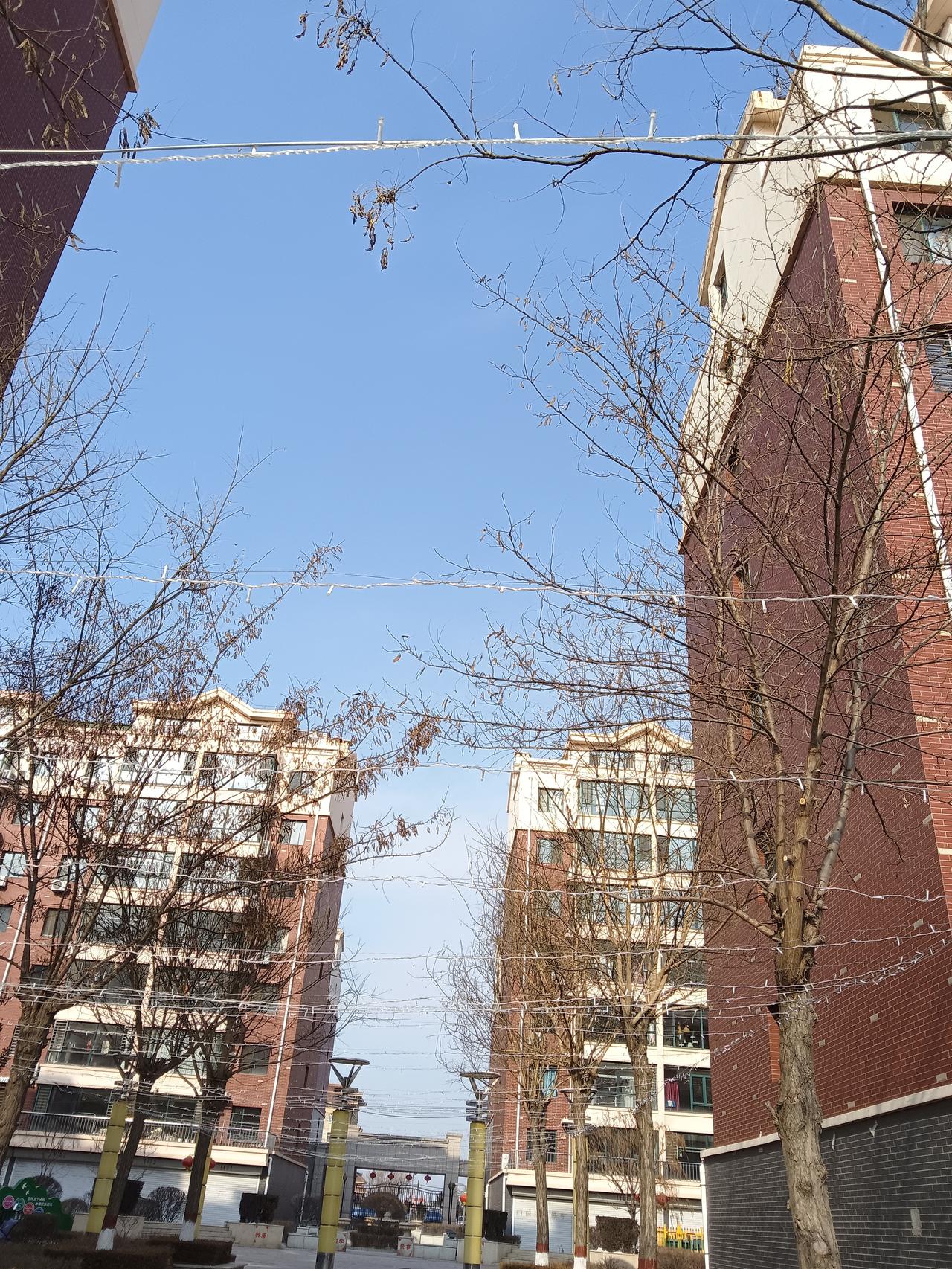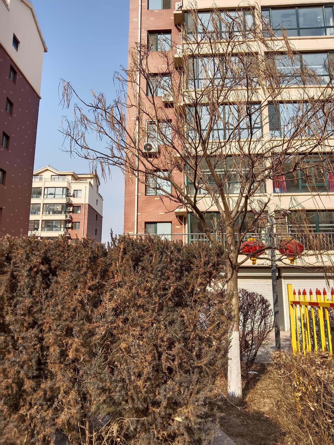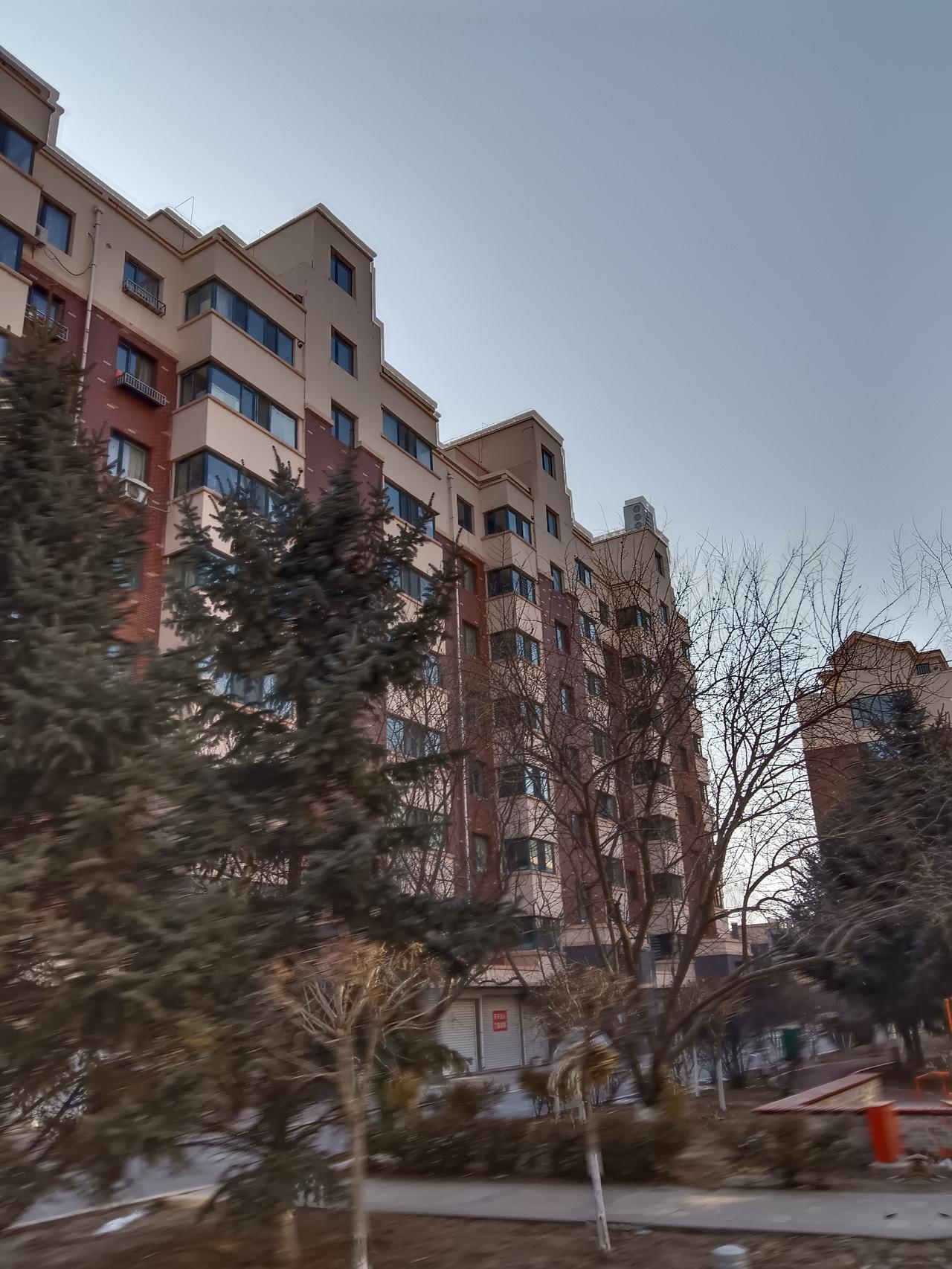 冬日暖阳洒在现代公寓上,绿树掩映,宁静祥和。