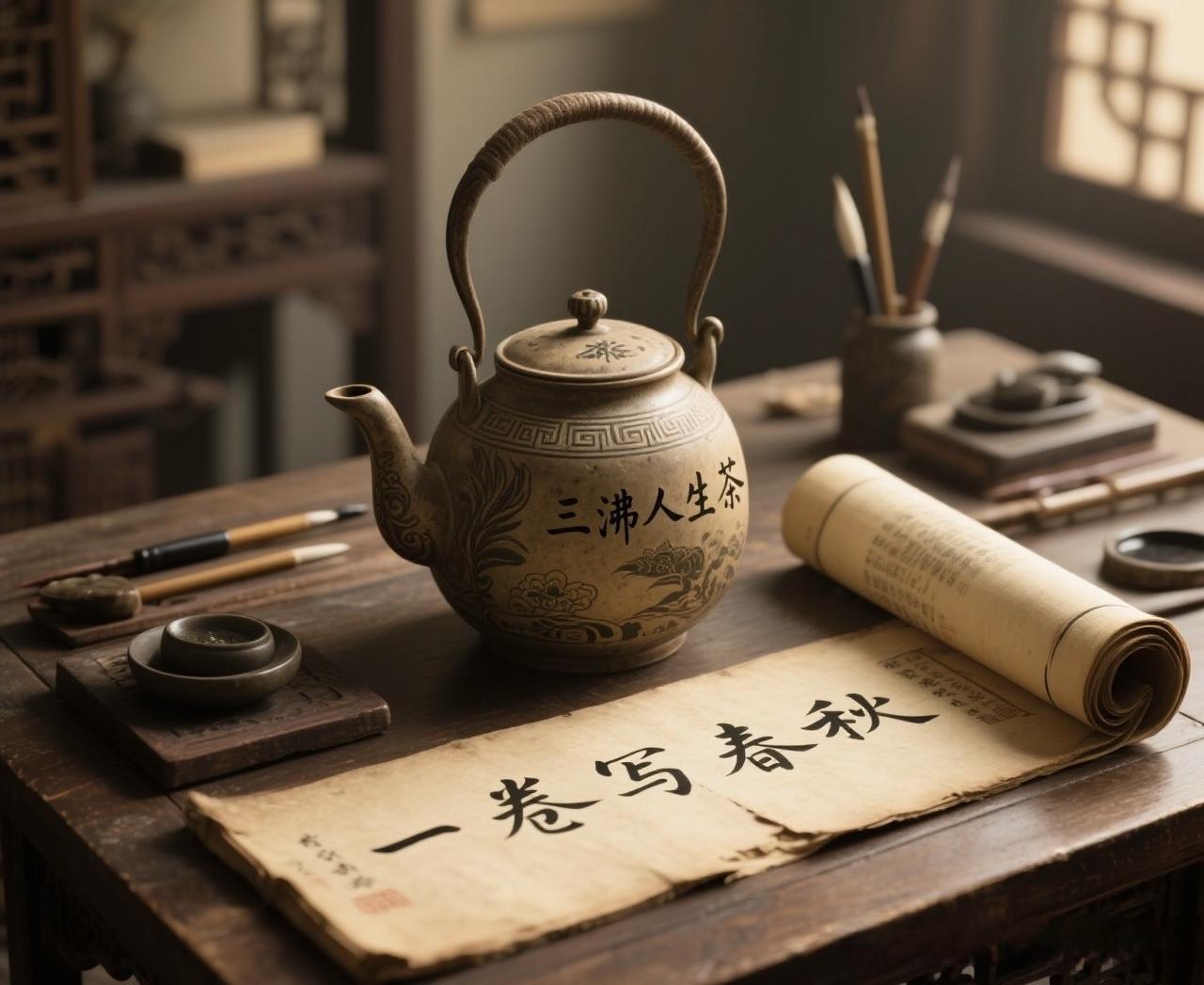 上联:品墨调琴烹岁月, 下联:落笔挥毫绘春秋, 下联:吟诗作画煮人生。
