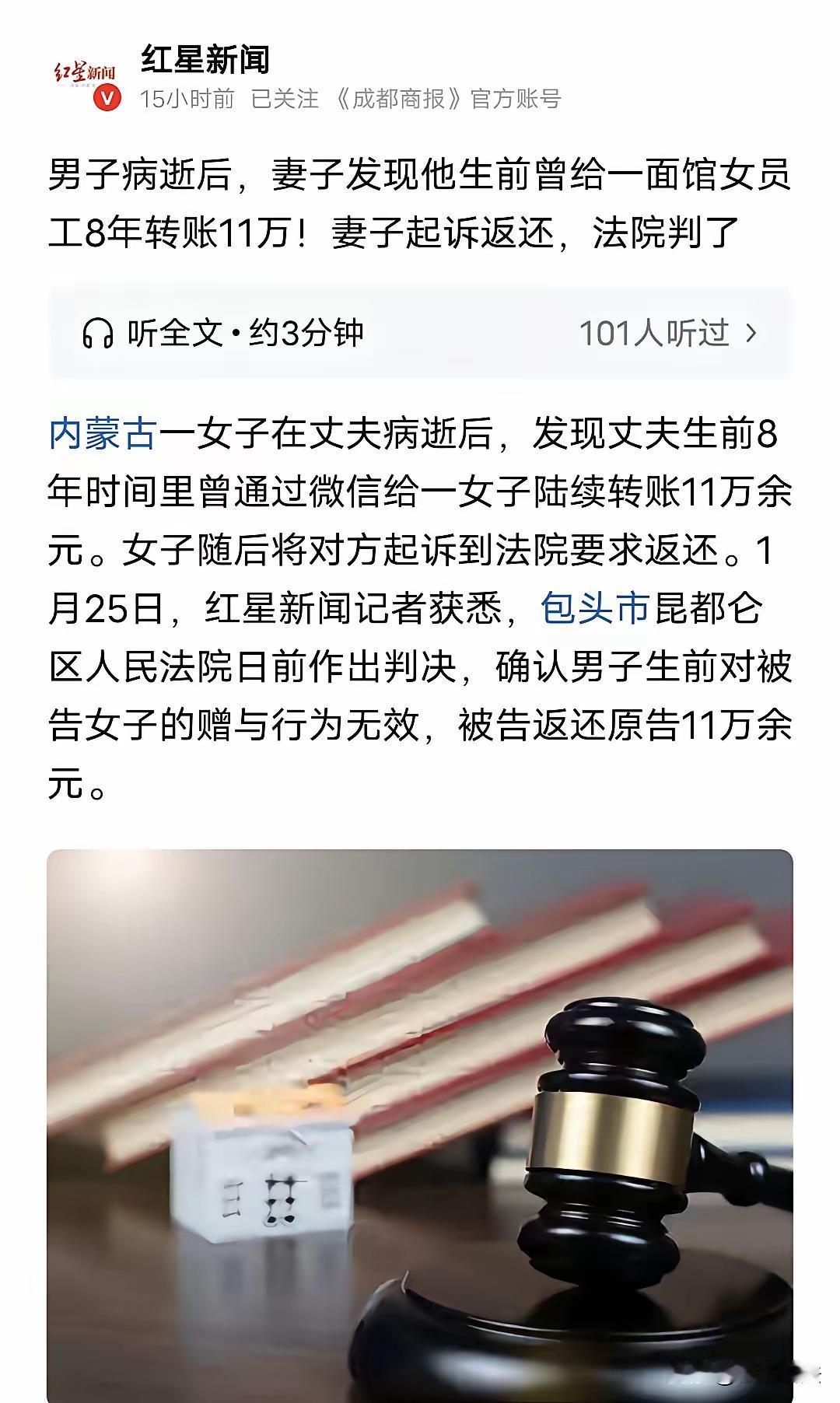 内蒙古,女子的丈夫病逝后,她收拾遗物发现丈夫在8年里给一面馆女员工转了117362元,她去找女员工要说法,女员工却说:他转钱给我,是让我帮他储值卡、买礼盒、买饭卡用,这钱我一分没拿,都是他消费了。见女员工死活不承认,女子一气之下告上法院。 内蒙古的郭女士还没从丧夫之痛里缓过来,丈夫王某走得突然,没留下只言片语,家里的大小事都压在她肩上。 她抱着丈夫的旧手机,想翻翻过去的照片聊以慰藉,点开微信支付账单的那一刻,手指却像被钉住般动弹不得。 账单密密麻麻,全是转给同一个人的小额转账:几十块、几百块,偶尔还有几块钱的零碎金额,没有备注,没有特殊数字。 从2017年到2025年,整整8年,一笔笔累加起来,总数竟有117362元。 11万多,对普通工薪家庭来说,是大半年的收入,是孩子的学费,是老人的医药费。郭女士只觉得脑子发懵,浑身发冷。 收款人名叫郭某乙,既不是亲戚,也不是朋友。多方打听才知道,这人是家连锁面馆的女员工,丈夫生前常去那吃面。 郭女士强压着怒火找到面馆,郭某乙见了她倒显得坦然,张口就来:“大姐,你别多想,王哥是老顾客,转的钱都是让我帮他充储值卡、买礼盒的,我一分没拿,全是他消费了。” 她还特意补充:“你看这八百多笔转账,要是有猫腻,怎么会没有520、1314这种数?纯粹是吃饭的开销。” 这话听着像那么回事,郭女士心里也犯过嘀咕:难道真是自己想多了? 可静下心来一算,就算天天顿顿吃面,8年11万,平均每天得花30多块,而且丈夫总有在家吃饭、出差的时候,哪来这么多消费? 郭女士要求看充值记录、消费小票,郭某乙却支支吾吾,拿不出任何凭证。 被逼到份上,郭女士没再退让,一纸诉状把郭某乙告上了法院。她的诉求很明确:这钱是夫妻共同财产,丈夫未经同意私自赠与,应全额返还。 法庭上,郭某乙依旧坚持“消费款”的说辞,可面对法官的质问,她拿不出任何能证明王某消费的证据,没有充值记录,没有提货签字,没有消费清单。 网友们看了这事也炸了锅:“8年八百多笔,平均三天一笔,这哪是吃饭,分明是细水长流的补贴!” “女员工拿不出证据就是心虚,真要是正常消费,面馆能没有记录?” “夫妻共同财产可不是说着玩的,一方偷偷给外人转钱,本身就不合法。” 还有人戳破关键:“就算是储值,花不完也该有余额,总不能一分不剩刚好用完11万,还分毫不差?” 法院审理后给出了明确判决:王某转账的117362元属于夫妻共同财产,他未经郭女士同意,私自向郭某乙转账,属于无权处分,该赠与行为无效。 同时,王某长达8年的隐秘转账,违背了夫妻忠实义务和公俗良俗,给郭女士造成了财产损失和精神伤害。最终判决郭某乙全额返还117362元。 这事看着是钱的纠纷,实则戳破了婚姻里最伤人的背叛。王某生前看似老实,却用八百多笔转账,给妻子埋下了一颗“定时炸弹”。 他以为细水长流就不会被发现,却忘了纸包不住火。婚姻里的信任一旦崩塌,哪怕人已不在,伤害也会延续。 好在郭女士清醒又勇敢,用法律捍卫了自己的权益。也给所有夫妻提了个醒:共同财产不是一人的私产,任何处分都该坦诚相待。 你觉得这判决合理吗?如果是你遇到这种事,会怎么做?欢迎在评论区聊聊~