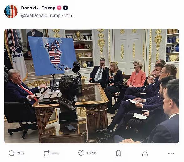 下面这张图片显然是经过P图伪造的,并非真实发生过的事件,核心依据如下: 1. 地图内容明显不符合现实, 图片里展示的地图将美国本土覆盖到了加拿大等国家的领土上,这是一个极具讽刺和夸张的虚构内容。现实中特朗普是多次说过要把委内瑞拉、加拿大等这些地方变成美国领土,但从未在白宫会议上展示过这样的地图。 2. 该地图的颜色、质感和周围的白宫会议场景完全脱节,肉眼观感就是后期强行合成的,与真实白宫会议的公开影像资料不符。 3. 传播渠道与动机 这张图属于网络恶搞类的“梗图”,主要用于调侃特朗普“美国优先”的外交政策,以及他曾提出“购买格陵兰岛”等争议性言论,并非来自特朗普的真实社交账号或官方发布。