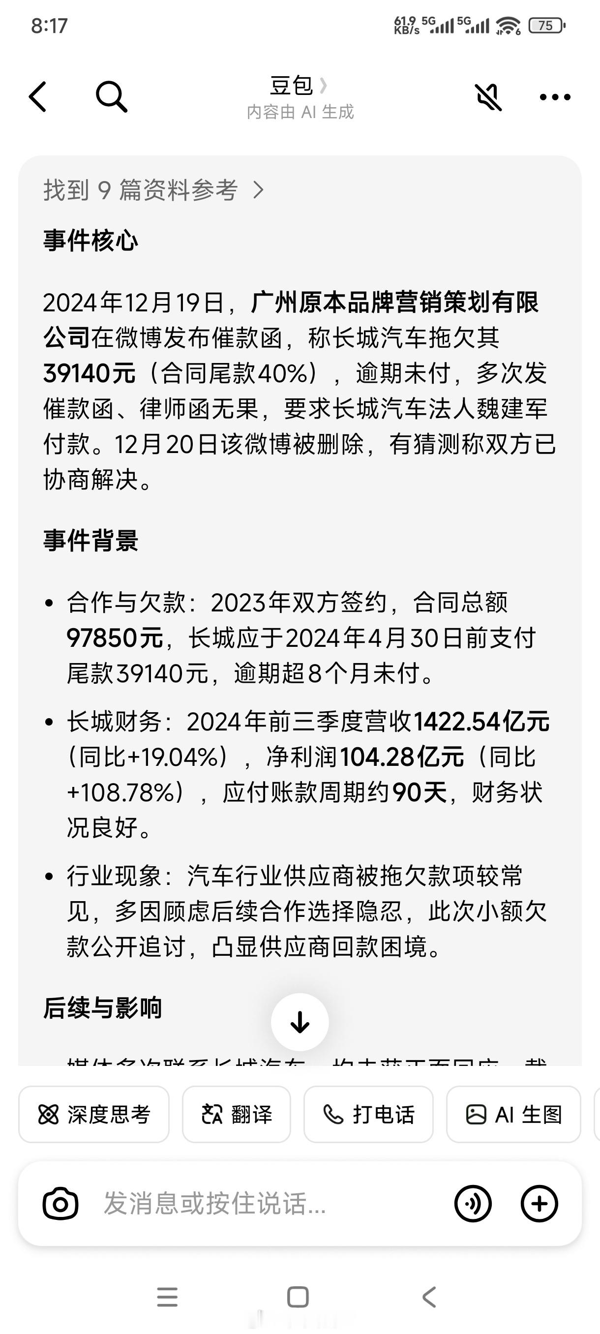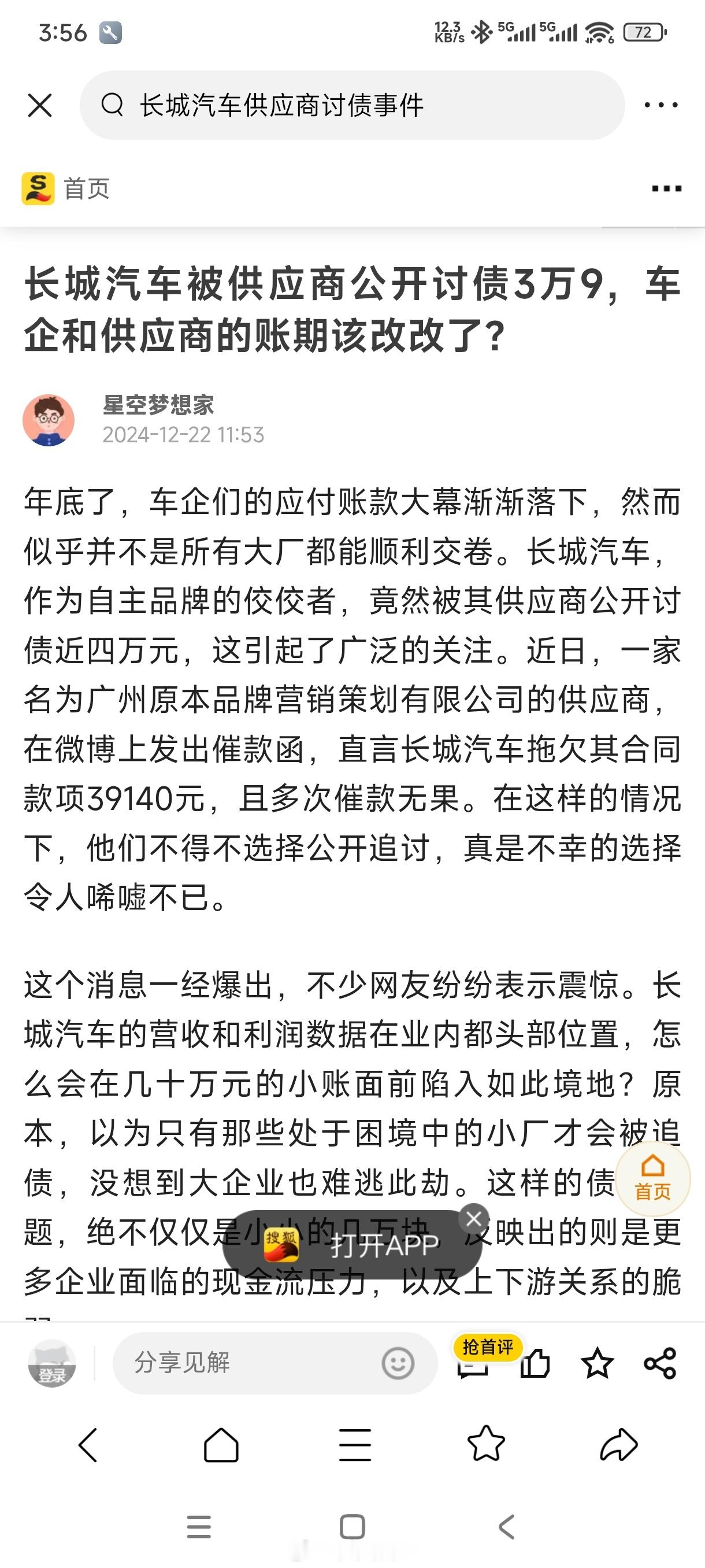 长城这个事是2024年发生的。2024年12月19日,广州原本品牌营销策划有限公司在微博发布催款函,称长城汽车拖欠其39140元(合同尾款40%),逾期未付,多次发催款函、律师函无果,要求长城汽车法人魏建军付款。12月20日该微博被删除,有猜测称双方已协商解决。现在又有人拿出来报道。是事情没有解决呢,还是有人拿此事恶心人?2025年,17家主流车企承诺“对供应商支付账期不超过60天”,长城汽车也是其中之一。