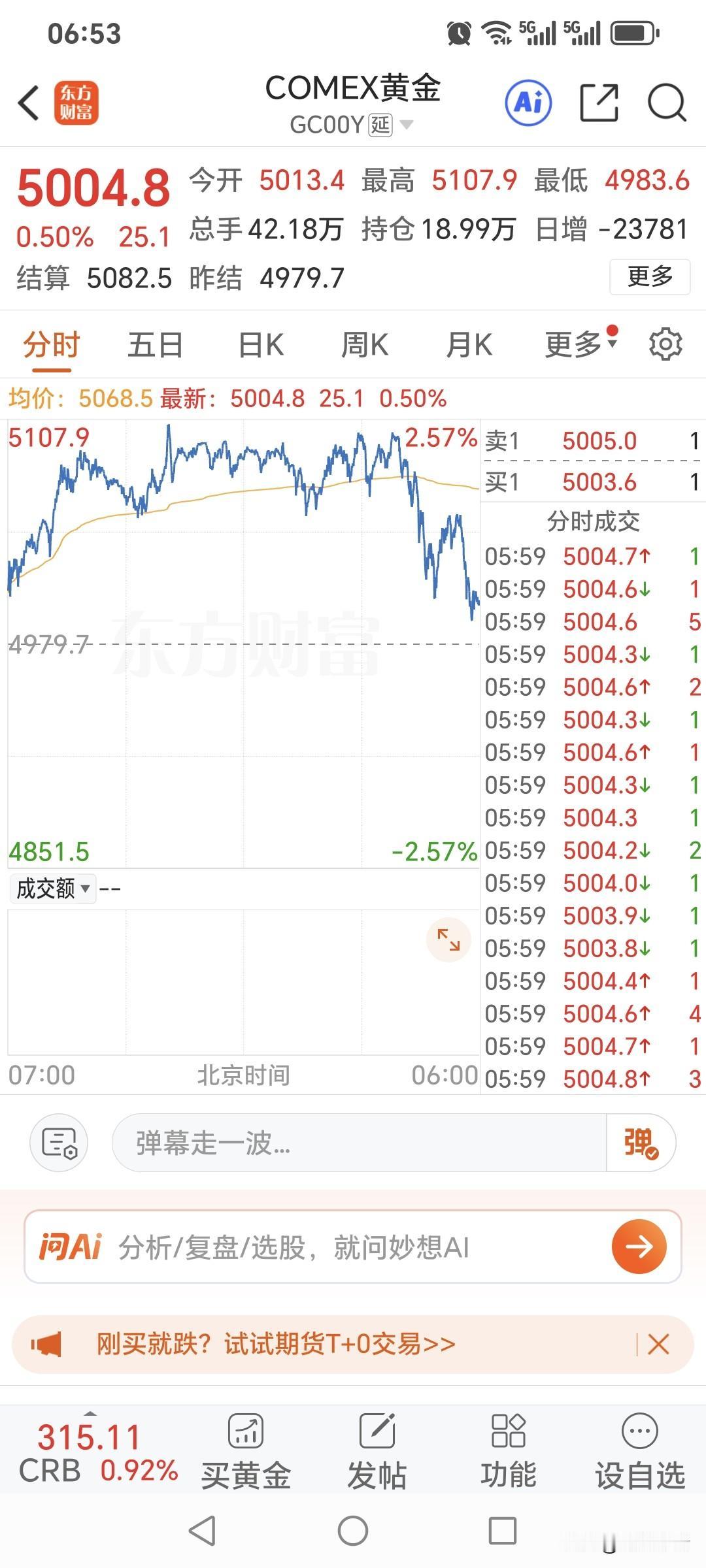 周一国际金价继续走强上涨, 盘中一度突破5100美元。 昨日国际金价 大幅高开,震荡运行。 开盘价5013.4美元, 盘中最高升至5107.9美元, 最低价4983.6美元, 最终收盘于5004.8美元, 较上一日上涨25.1美元。 对于国际金价, 期货小褚认为 经过连续暴涨, 短期存在较强回调的可能性!