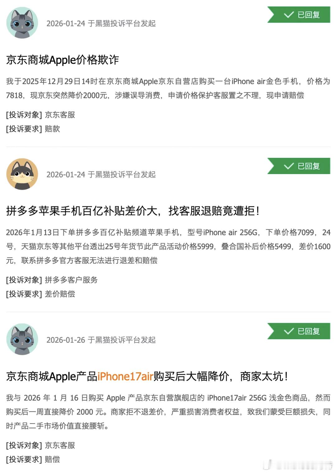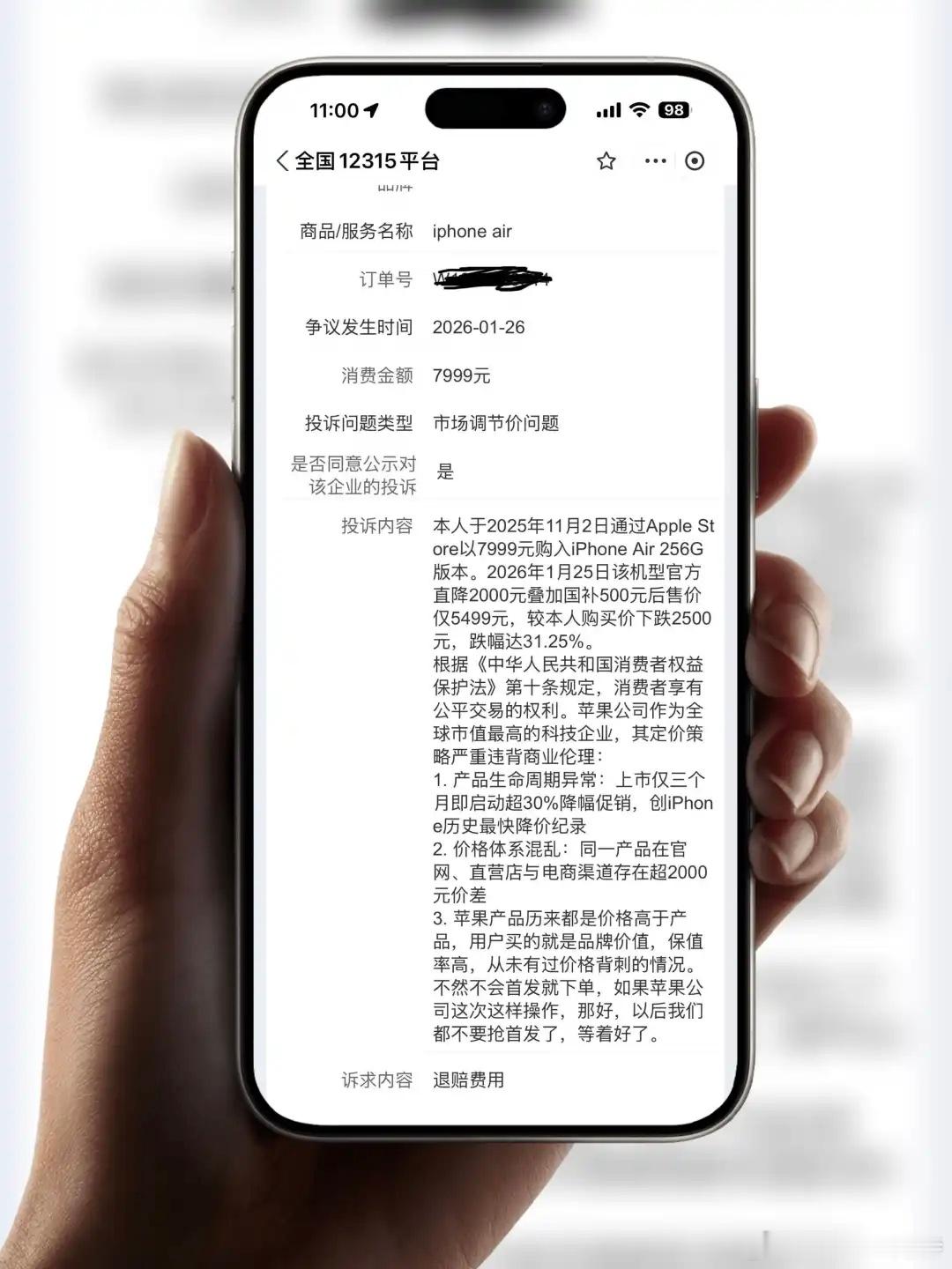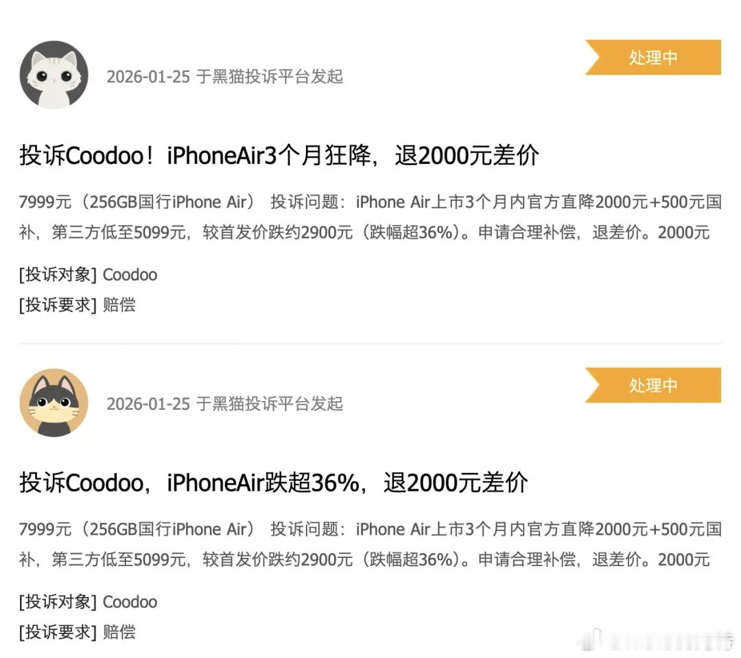 iPhone Air官方价格暴跌2000元iPhone Air 发售三个月降价 2000 元,苹果虽然是应对销量疲软的无奈之举,但也寒了很多早早入手 Air 的果粉的心。这几天发现有原价入手 iPhone Air 的网友已经向 12315 举报苹果公司,要求退赔费用。站在消费者角度,苹果三个月就把 iPhone Air 降价 2000+500,确实挺令人寒心的。不过普遍来说购买后产品降价,以往来看也很少有维权成功的案例,毕竟是市场经济行为,房价腰斩了总不能找开发商退差价。换个思路,未来产品涨价了,消费者也不可能给商家补差价。iPhone