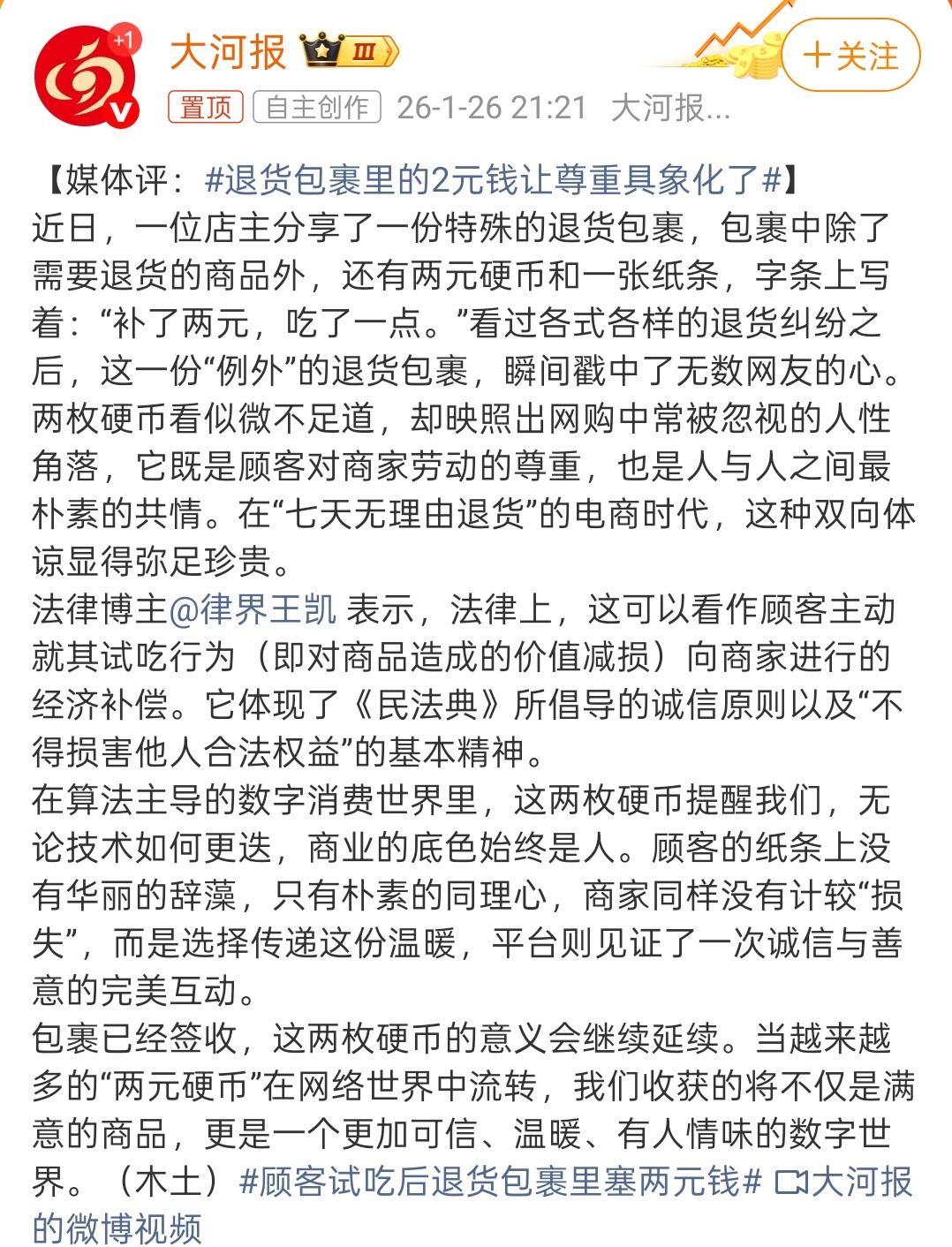 这个小细节特别戳人,能看出顾客的高素养和边界感——既坦诚处理退货需求,又懂得试吃并非“免费”,用小额补偿弥补商家的食材成本和劳动,不是理所当然的索取,而是带着体谅的互相尊重。这种细节里的分寸感,比单纯的好评更能让商家感受到被理解,也是人与人之间最舒服的相处方式。退货包裹里的2元钱让尊重具象化了