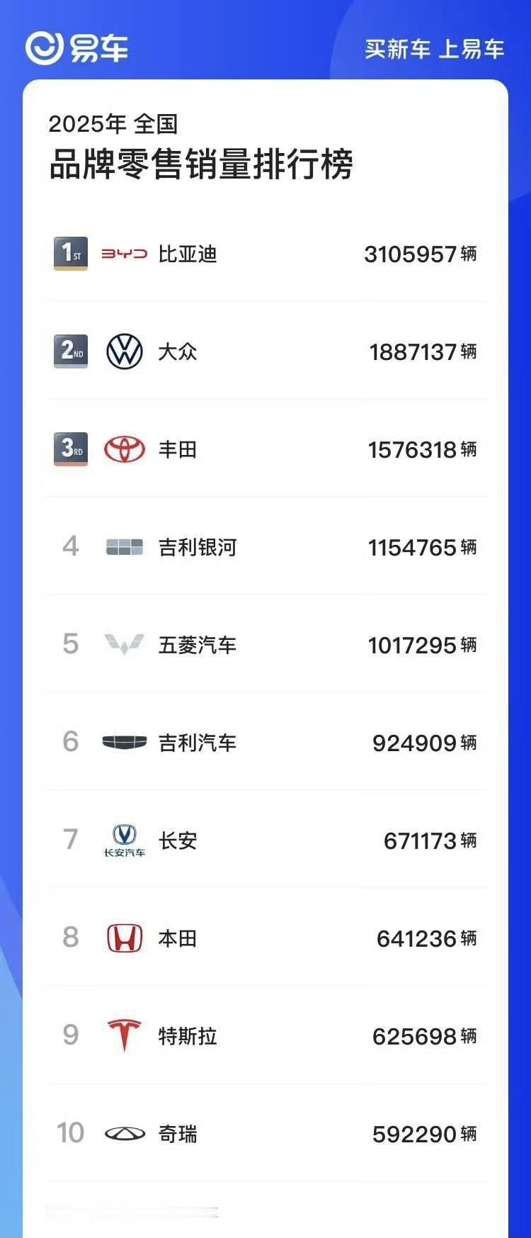 2025年全国汽车品牌零售销量榜: 🏅比亚迪,3105957辆 🥈大众,18