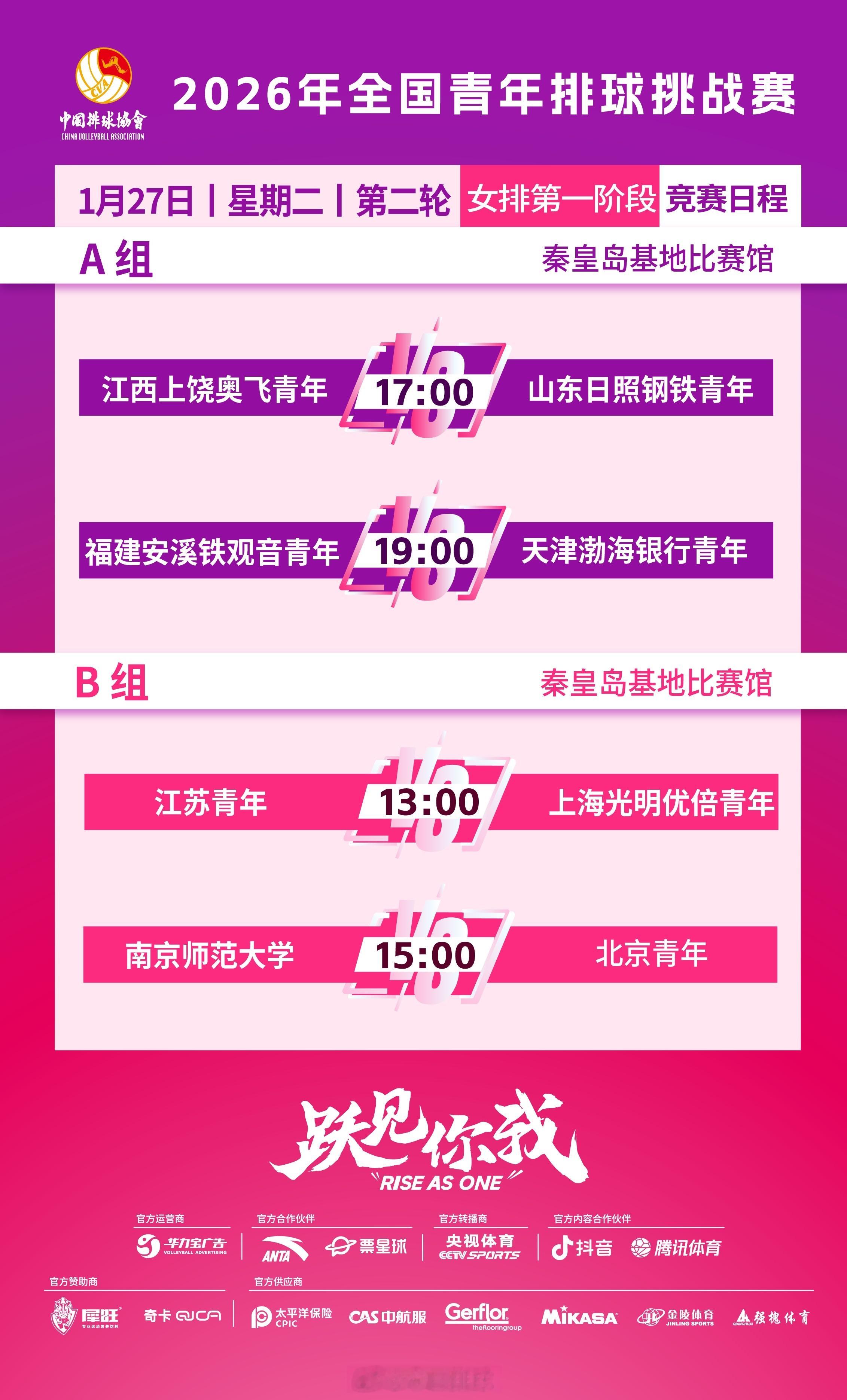 2026年全国青年排球挑战赛 男子组和女子组今天(1月27日)小组赛第2轮的竞赛日程如图。比赛在央视频、央视体育APP和微博等全程直播和回放。