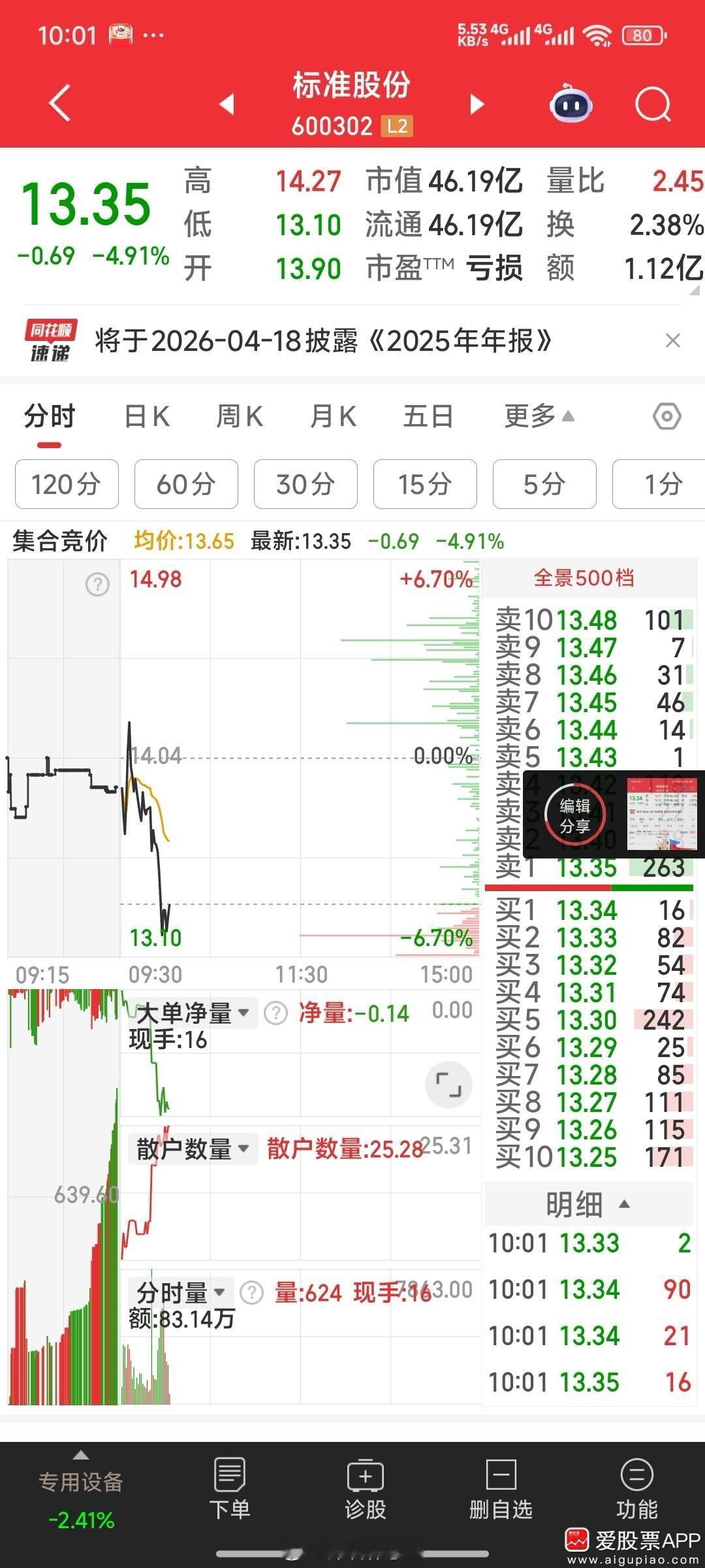 【无须怕】标准股份现在回落,无非是主升前的洗盘,无须怕,13.3元还可加仓,目标16元不变。