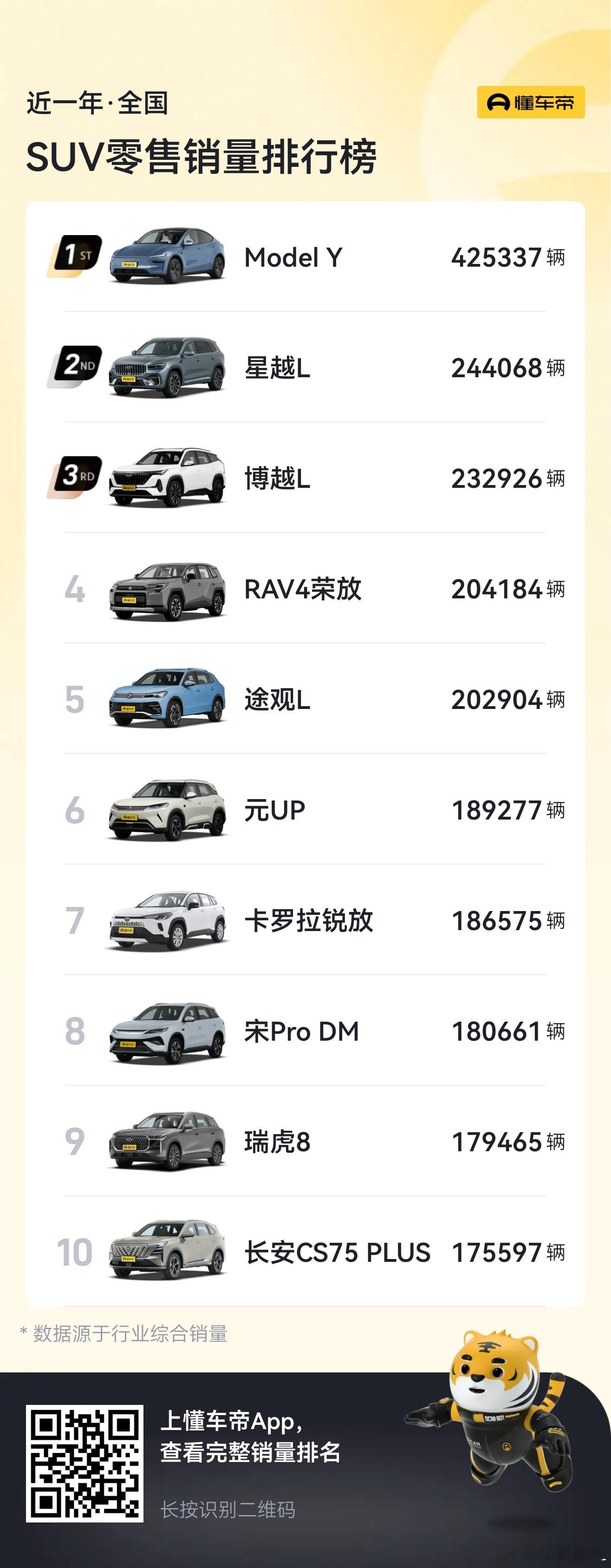 2025年SUV销量排行。第一名,特斯拉Model Y,断崖式领先。第二到第五,全是燃油车。
