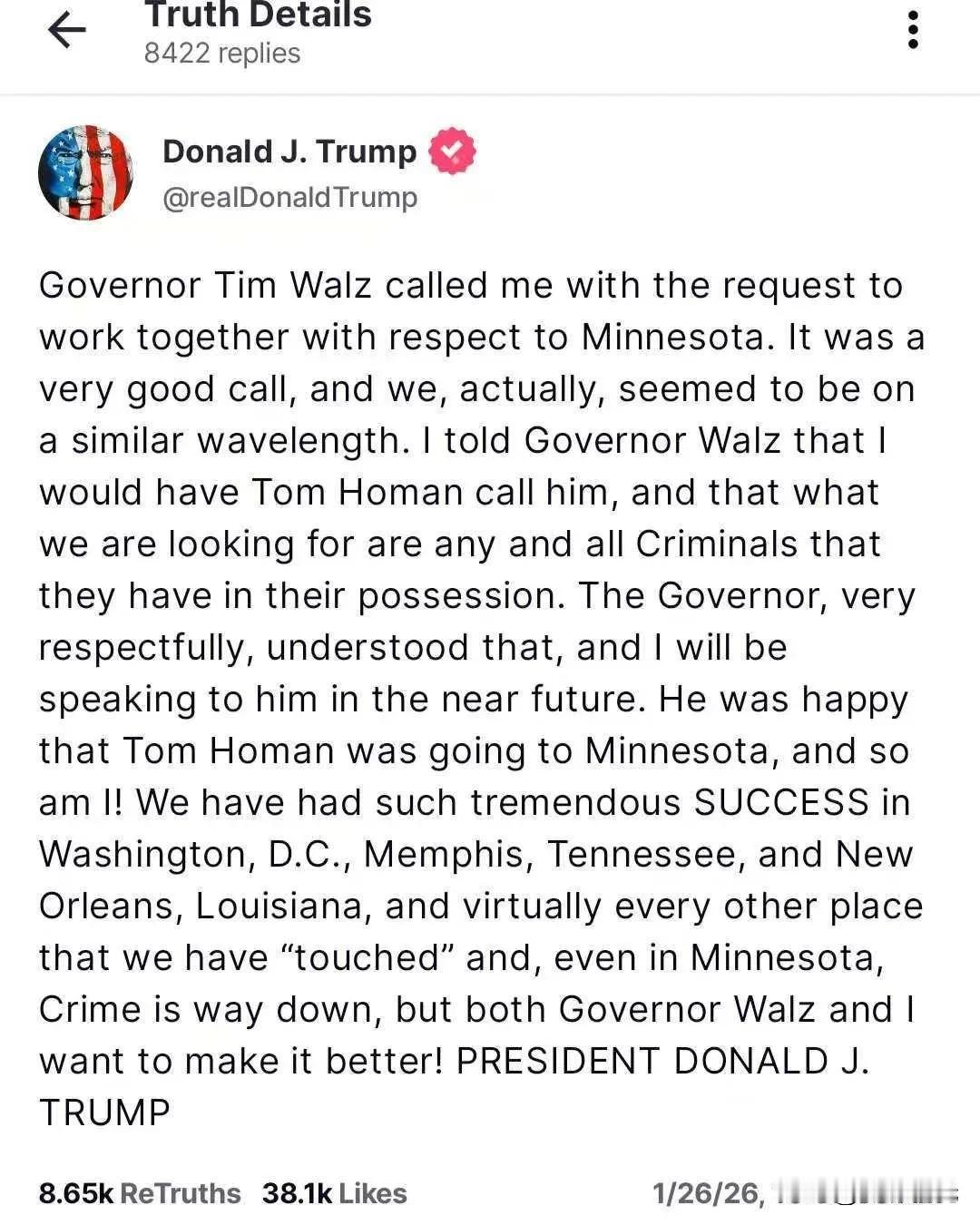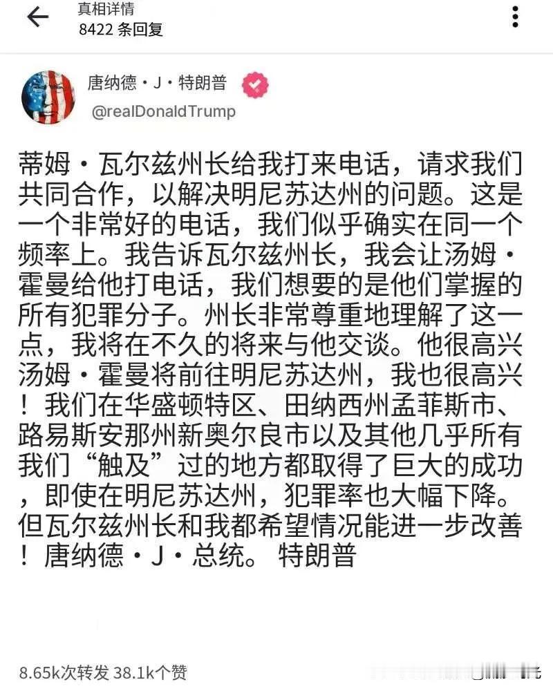唐纳德·J·特朗普:蒂姆·瓦尔兹州长给我打来电话,请求我们共同合作,以解决明尼苏达州的问题。这是一个非常好的电话,我们似乎确实在同一个频率上。我告诉瓦尔兹州长,我会让汤姆·霍曼给他打电话,我们想要的是他们掌握的所有犯罪分子。州长非常尊重地理解了这一点,我将在不久的将来与他交谈。他很高兴汤姆·霍曼将前往明尼苏达州,我也很高兴!我们在华盛顿特区、田纳西州孟菲斯市、路易斯安那州新奥尔良市以及其他几乎所有我们“触及”过的地方都取得了巨大的成功,即使在明尼苏达州,犯罪率也大幅下降。但瓦尔兹州长和我都希望情况能进一步改善!唐纳德·J·总统。特朗普8.65k次转发38.1k个赞2026年1月26日,上午10:37:50