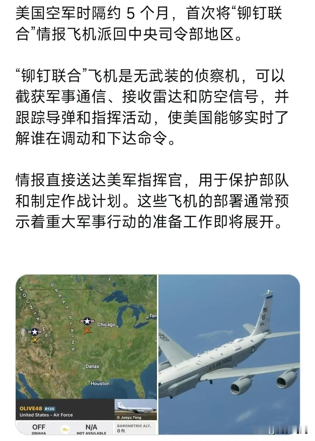 美国空军时隔约 5 个月,首次将“铆钉联合”情报飞机派回中央司令部地区。 “铆钉联合”飞机是无武装的侦察机,可以截获军事通信、接收雷达和防空信号,并跟踪导弹和指挥活动,使美国能够实时了解谁在调动和下达命令。 情报直接送达美军指挥官,用于保护部队和制定作战计划。 这些飞机的部署通常预示着重大军事行动的准备工作即将展开。 美国情报报告称,伊朗政府的实力比1979年革命以来的任何时候都要弱,大规模抗议活动和经济困境削弱了其对权力的掌控。 特朗普已听取了有关情况的简报,并警告伊朗不排除采取军事行动的可能性。虽然抗议活动有所缓和,但美国官员表示,政府仍然不稳定。 据报道,美军正准备使用 B-2“幽灵”、 B-1 “枪骑兵”、F-22“猛禽”、F-35 和 B-52 飞机对伊朗作战,行动将经由迪戈加西亚岛和“亚伯拉罕·林肯”号航母打击群进行。 在过去的 24 至 48 小时内,美国和北约在中东地区的空中行动有所加强,这表明为可能对伊朗发动打击而集结兵力的进程正在迅速推进。 哈梅内伊的外交顾问拉里贾尼告诉伊朗媒体:“在我看来,我们可以在不到两到三周的时间内制造出原子武器。 ” 他还表示:“在为期 12 天的战争中,伊朗只使用了不到 25% 的能力。以色列侵略后,伊朗75%的军事能力仍然完好无损。”美战机中东部署