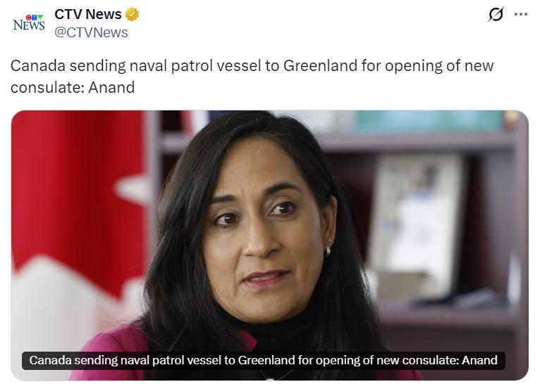 加拿大外交部长阿妮塔·阿南德1月26日表示,加拿大下周在格陵兰岛开设新领事馆时,一艘加拿大海军北极巡逻舰将抵达现场。
