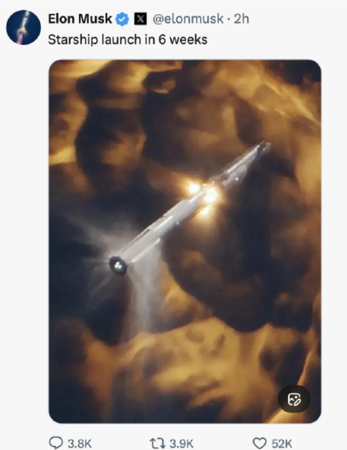 SpaceX 马斯克说,6周内,将实施2026年星舰第一次飞行测试。
