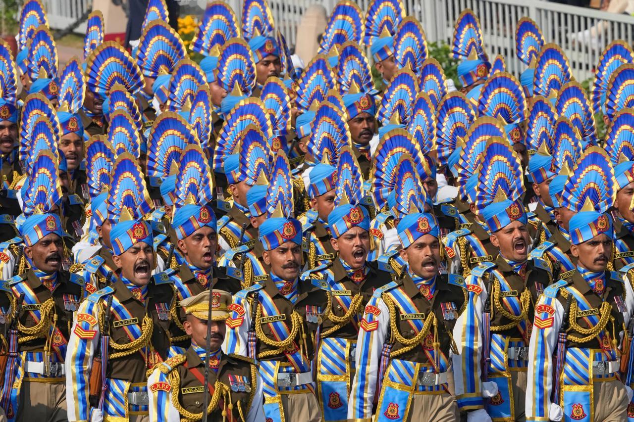 1月26日,印度共和国日阅兵精彩阅兵高清图片! 士兵们齐步前进,自动步枪抵在身体上。队伍后面跟随的是装甲车和步战车队,随后是机动导弹系统、雷达、坦克和军事指挥单位。头顶上,战机划破新德里的天空。 1月26日周一,印度在首都新德里的卡塔维亚上举行了这场壮观的游行,庆祝印度第77个共和国日,展示其军事力量,成千上万的人沿着道路观看游行队伍。