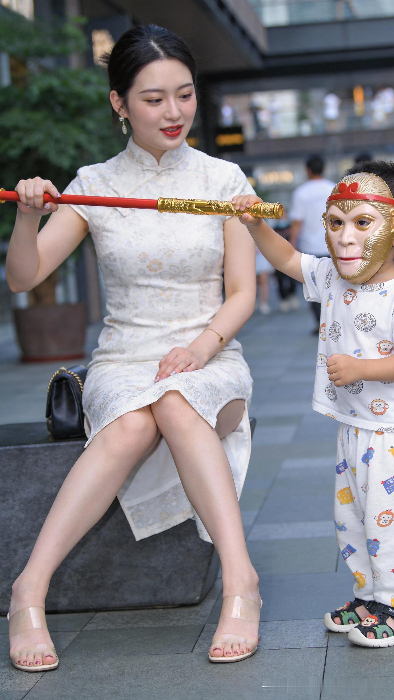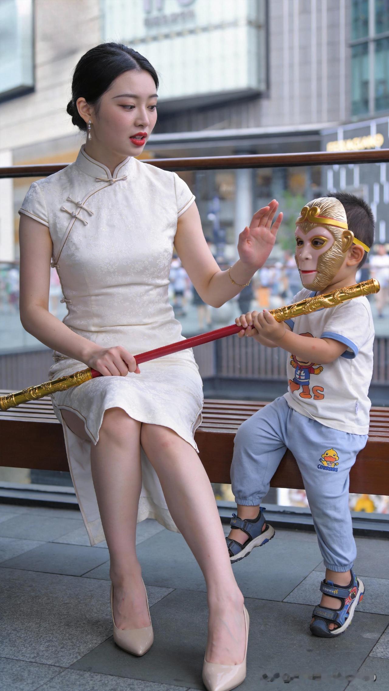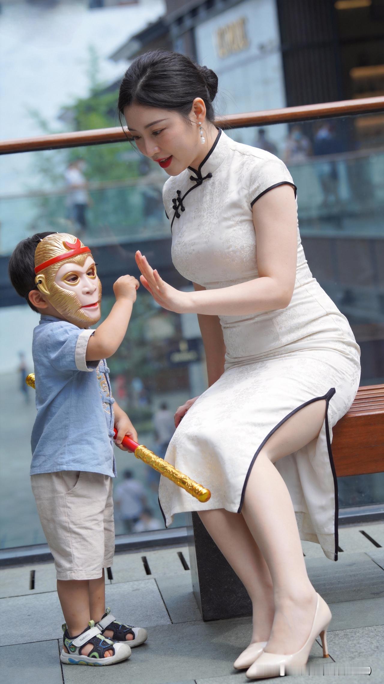 商圈偶遇悟空萌娃,金箍挥耍,追母嬉闹,顽态可掬,母爱藏嗔,遂成七律记之 观悟