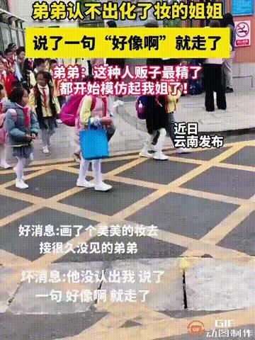 “笑不活了!”云南一位家长没空去学校接孩子,于是就让姐姐代替,姐姐特意化了一个美美的妆,想让弟弟眼前一亮,但结果却令人意想不到。 放假在家的云南这位大学生姐姐,日常一直以素颜戴黑框眼镜的模样陪伴在四年级弟弟身边,姐弟俩相差八岁,平日里打打闹闹的相处模式,让弟弟早已熟悉了姐姐最真实随意的样子。 这天家里家长因事无法前往学校接孩子,姐姐便主动承担起代接的任务,心里还悄悄酝酿着给弟弟一个小惊喜。 她翻出化妆品,认真地给自己化上了淡底妆,细细描了眉,涂上温柔的豆沙色口红,还特意换上了新的碎花裙,将头发打理成卷发,一改往日的运动休闲风格。 为了让这份惊喜更圆满,她提前十五分钟就来到学校校门口等候,手里还攥着弟弟最爱的草莓味棒棒糖,满心期待着弟弟看到自己新造型时的惊喜表情。 放学铃声响起,校园门口瞬间热闹起来,孩子们排着队涌出来,弟弟也夹杂在同学中间,蹦蹦跳跳地朝着校门口走。 姐姐一眼就看到了弟弟,立刻笑着挥起手,喊着对方的小名,手里的棒棒糖也晃了晃,试图吸引弟弟的注意。 听到声音的弟弟转过头,目光落在姐姐身上时,脚步瞬间停住,眼睛瞪得圆圆的,带着满满的疑惑凑上前来。 盯着姐姐的脸认真打量了足足三秒,小嘴里只轻轻挤出一句“好像啊”,便扭头拽着身边同学的手,头也不回地朝着校门口走。 全程没有和姐姐说第二句话,仿佛眼前的人只是一个和姐姐长得相似的陌生阿姨。 突如其来的状况让姐姐瞬间愣在原地,手里的棒棒糖差点没拿稳掉在地上,脸上的笑容也僵住了。 校门口不少来接孩子的家长都看到了这一幕,有人忍不住低低笑出了声,这让姐姐更觉得又气又笑。 她站在原地懵了两秒,看着弟弟渐渐走远的小背影,赶紧抬脚追了上去,一边追一边喊着弟弟的大名,几十米的距离,让这场充满期待的惊喜,变成了一场哭笑不得的“追娃大戏”。 姐姐终于追上弟弟,伸手拽住了他的胳膊,被拉住的弟弟回头时,脸上依旧是满满的疑惑,眼神里的陌生感丝毫未减。 无奈之下,姐姐抬手擦了擦嘴角的口红,露出了弟弟熟悉的眉眼,没有了妆容的修饰,那张脸瞬间回到了弟弟日常认知中的模样。 直到这时,弟弟才哇了一声反应过来,原来眼前这个漂亮的陌生阿姨,就是自己的亲姐姐,小脸也因为这份后知后觉的尴尬微微泛红。 他拉着姐姐的胳膊,小声吐槽姐姐化了妆的样子看着怪怪的,还特意叮嘱以后别化这么浓,怕身边的同学看到,误以为自己早恋了。 不少网友分享起自家的同款经历,有人说自家孩子认不出化妆后的妈妈,有人吐槽弟妹认不出换了发型的家人。 这些相似的日常瞬间,让网友们纷纷感慨,孩子的认人逻辑格外纯粹,他们记在心里的,永远是家人最真实、最随意的样子,一点点的外形改变,就足以让他们陷入懵圈。 还有网友在评论区调侃,这个云南弟弟是“直男审美初显”,只认素颜的亲姐,不认化妆的漂亮阿姨,也有人称赞姐姐的化妆技术太厉害,素颜和妆后判若两人,堪比“换头”。 姐姐也在评论区和网友互动,吐槽自家亲弟主打一个“六亲不认”,精心打扮的妆容全白画了,连特意买的棒棒糖都差点失去意义。 这场认亲“翻车”的趣事,被姐姐讲给爸妈听后,也让家人笑作一团,妈妈还笑着调侃姐姐,早告诉她别化太浓,弟弟年纪小,哪里见过这样的姐姐。 嘴上说着下次再也不化妆接弟弟的姐姐,心里却悄悄记着这件事,想着下次化个更淡的妆再试试,非要和自家亲弟较较劲。 而让人觉得暖心的是,这件事之后,弟弟反倒对姐姐的化妆术产生了好奇,拉着姐姐的手嚷嚷着要学画眉毛,姐姐也温柔地告诉弟弟,素颜的样子就很好,这样的姐姐,才是孩子能一眼认出的模样。 从满心期待的惊喜筹备,到校园门口的意外翻车,再到全网刷屏的趣味热议,这场发生在云南的姐弟日常,没有轰轰烈烈的情节,却凭借最真实的细节,戳中了无数网友的内心。 就像那个喊着“好像啊”就转身走的云南弟弟,他认不出的是化了妆的姐姐,却永远能认出那个素颜陪他玩、给他买零食、护着他的亲姐姐。 孩子的世界很简单,他们对亲人的记忆,从来都无关精致的外表,只关乎朝夕相处的陪伴。 云南这位姐姐的一场精心化妆,换来弟弟一句软糯的“好像啊”,也让我们看到,亲情最动人的模样,从来都在这些不期而遇的趣味日常里,在那些最真实、最纯粹的相处瞬间里。
