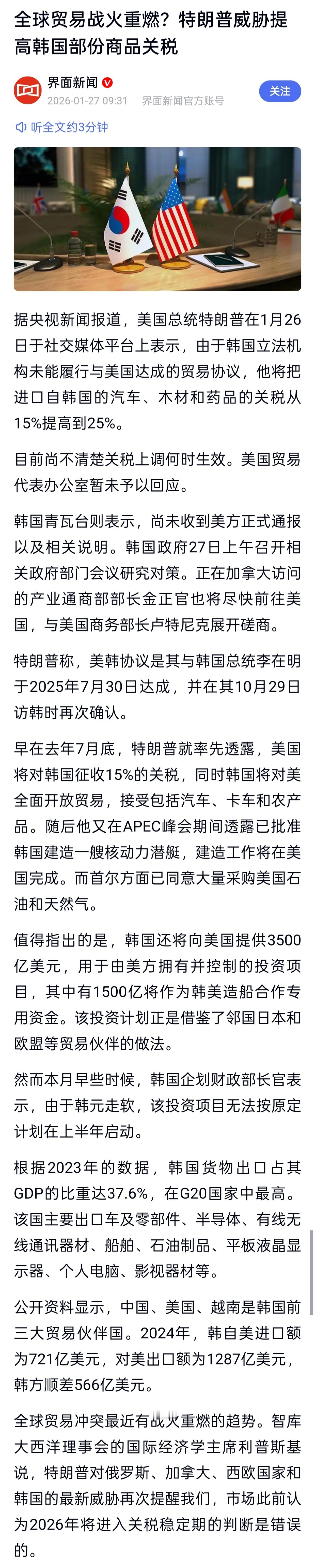 呵呵,前两天韩国称因韩元贬值,拒绝向美国提供200亿美元的“孝敬”,现在川普回过头来就一巴掌拍在韩国脸上 川普声称因韩国未执行美韩协议,把包括汽车、木材、药品在内的多项韩国商品进口关税由15%涨至25% 美国就是要杀了他们的狗吃肉,你们竟然敢对主人呲牙,还不上供,真是大逆不道!特朗普声称中国正完全接管加拿大烽火问鼎计划