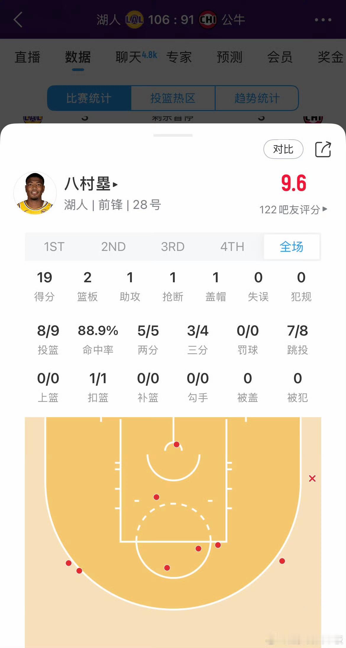东契奇连续投入三分,公牛被打懵了,湖人125-112领先13分了,比赛只剩2分钟,湖人稳了。 八村垒今天绝对是最佳第六人。湖人得分上20的3人,他是第三个。