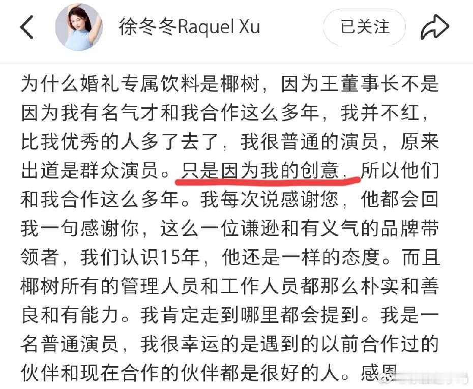 徐冬冬和尹子维婚礼的专属饮料,是椰树椰汁!椰树老板跟徐冬冬关系特铁,俩人都是那种讲义气、直来直去的性子。徐冬冬老说,“从小喝到大”这句广告语,创意其实是她提的,后来被老板拿去用了。这次的椰汁特别版,新郎尹子维还友情出镜了,你别说,这创意真挺有意思的,透着股喜庆劲儿。虽说有点“土到极致”,但反过来想,这不也是一种特色嘛,哈哈!