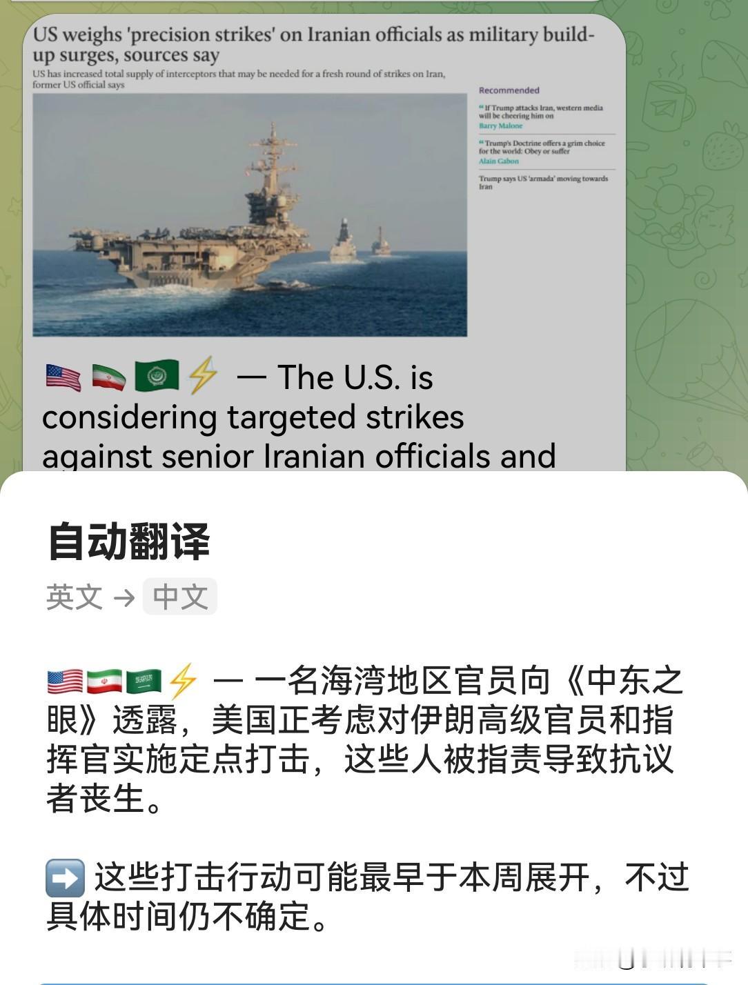 西方媒体关于未来美国对伊朗发动军事行动的报道。 不管是未来几天内发起,还是目前特朗普尚未做出最终决定,伊美冲突已不可避免。至于什么时候发起,美国和以色列等国肯定不会提前告诉你,只能由时间证明吧。