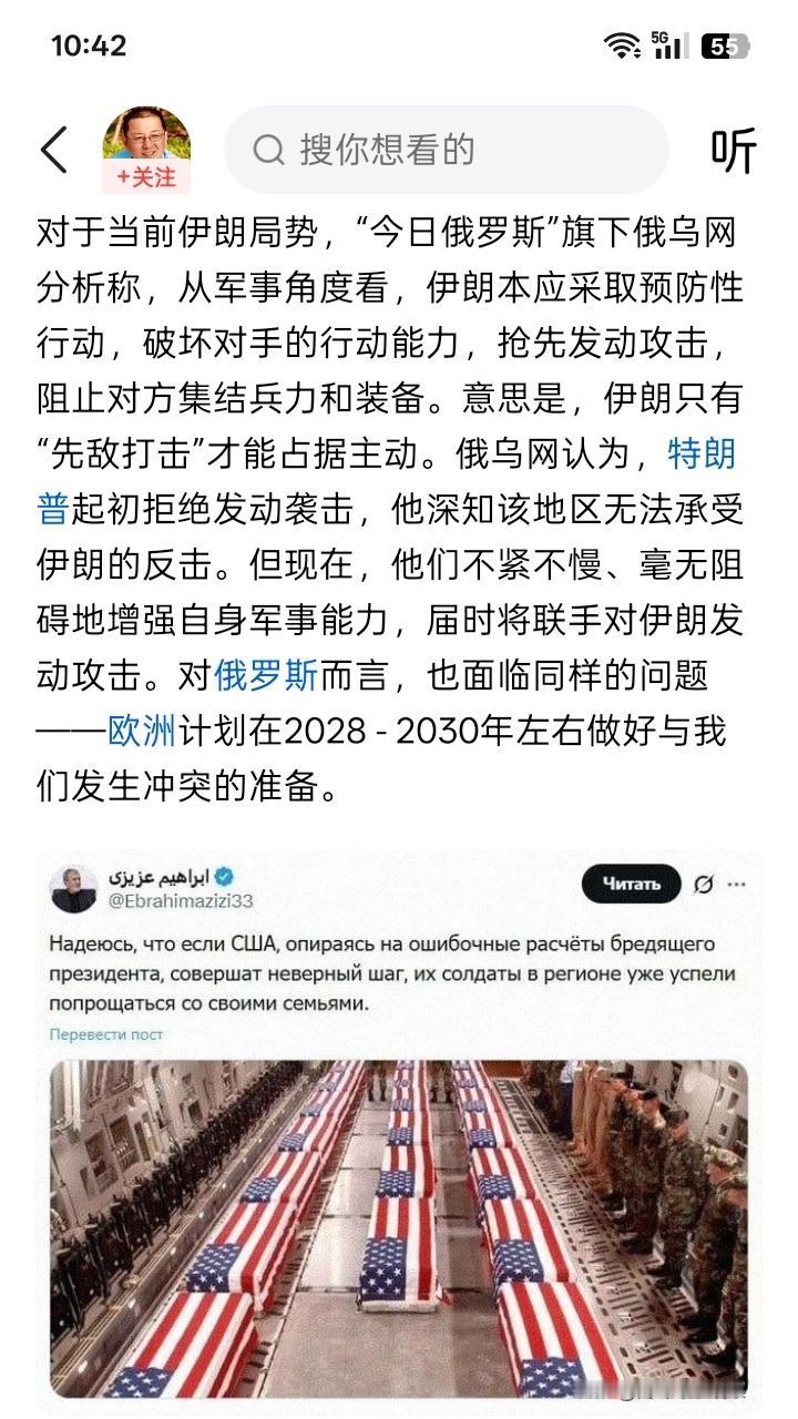恨人不死吗? 天哪!俄罗斯的媒体居然让伊朗军队“先敌打击”,以便占据主动。 据网络上的消息透露,《今日俄罗斯》下属的俄乌网站分析,“从军事角度看,伊朗本应采取预防性行动,破坏对手的行动能力,抢先发动攻击,阻止对方集结兵力和装备。”看了这样的分析,着实让人大吃一惊,鸡皮疙瘩都起来了。这哪里是分析,分明就是落XX石。 难道他们忘记了,哈马斯武装组织、黎巴嫩真主党武装组织、也门胡塞武装组织,估计都应该是先敌打击,占据主动。结果怎么样呢?他们看不到、还是没有看到?就连俄罗斯对乌克兰的特别军事行动,大概也是先敌打击,占据主动,结果又怎么样呢!还不一样是伤亡巨大,损失惨重,深陷战争泥潭,并且好像至今无法自拔。 再看看他们的盟友巴沙尔时期的叙利亚军队的表现,后果虽然谈不上骇人听闻,毛骨悚然,但总应该是记忆犹新,印象深刻吧。