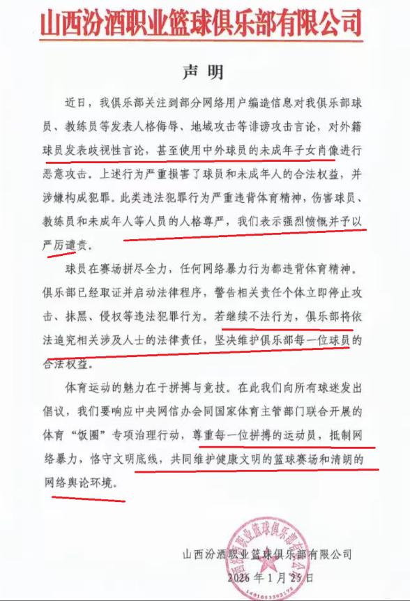 忍无可忍!深夜11点,山西队发布了严正声明! CBA常规赛,山西队与广东队的比赛结束之后,引起了巨大的争议,有意思的是,争议的本身, 并不是比赛的胜负,而是山西队球迷迪亚洛一系列的行为,在比赛中,迪亚洛导致了广东队多名球员受伤,甚至,迪亚洛还挑衅现场球迷,并且做出了一些过分的动作。   俱乐部很少这个时间点发声,他们不是在为赢球高兴,也不是在为裁判不公喊冤,而是把炮口对准了网络。   原因很直接,主力外援迪亚洛遭到了网友们的围攻,言语刺耳到让人绷不住,已经不是评球那么简单。   山西队很清楚,球场风云过去,但网络上的风波未灭,外援还得顶着骂声比赛,气氛完全绷紧了。   事情的起根,其实是山西队和广东队的比赛。那场对抗激烈,又是关键时刻,迪亚洛场上的表现彻底惹恼了广东球迷。他动作大,还闹出个挑衅裁判的手势,当场就有人看不惯。   比赛结束后,CBA官方很快出手,一分证据一分处理,直接给迪亚洛三万元的罚单,连带着主教练潘江也搭进去一万,理由就是这情绪管理太差,出了风头就得买单。   有了官方定性,本以为事情就此过去,没料到网上的热闹才真正开始。一边是广东这边球迷火力全开,言辞越来越猛;另一边是部分球迷情绪“升级”,从批评球风,变成了攻击迪亚洛本人的恶语,甚至连地域、种族的词眼都冒了出来。   这已经不是简单的不满,而是演变成了网上公开羞辱。山西队看到这些,明知外援有错,也不能眼看球员在网上被“围殴”,态度坚决表示,谁要是再造谣,直接法务见。   外援迪亚洛难免尴尬,作为职业球员,他本应该把精力都用在球场和成绩上,但这次情绪溃堤,直接在赛场上和观众较真,出了风头,也不得不接下罚单。   网上吵归吵,可一旦升级成恶毒的人身攻击,甚至有罔顾底线的脏话,那球场上再有恩怨也变了味,道理全跑偏了。   站在俱乐部的角度,既不能护着球员盖过去错事,也不能看着球迷把自己的球员骂到崩溃。   山西俱乐部明确表态不是护短,而是把底线划清楚:体育圈可以有对抗,可以讨论对错,但跨过基本做人底线,对人进行诋毁,不管骂谁都不行。   毕竟一个职业环境,不能靠骂人、造谣来制造热度,更不能让歧视标签在联赛里横行。说到底,赛场需要激情,网络评论也要有尺度,每个人都应该清楚自己情绪的边界。   输了赢了都算事儿,但别让一场篮球比拼绑架成网络社会的发泄场,更不应该因为输球,就把所有戾气丢给外援。这既让规则变了味,也让喜欢篮球的氛围变得糟心。   这场风波给所有人提了个醒。球员要学会控制情绪,别让一时冲动毁了形象;球迷更要注意,发声要有底线,不能为了一时痛快,让球场外的讨论变成网络暴力秀。   山西队这次公开声明看似是护犊子,其实也是替整个联赛敲了警钟。大家都想看精彩的比赛,没人想看到骂战毁了热爱的运动。   联赛以后还会有对抗,还会有冲突,但要学会在热爱和理性中找平衡。一个健康的篮球环境,不靠喊口号,也不靠网络上的脏水,而是每个人都守住底线,给赛场上的人留点空间。