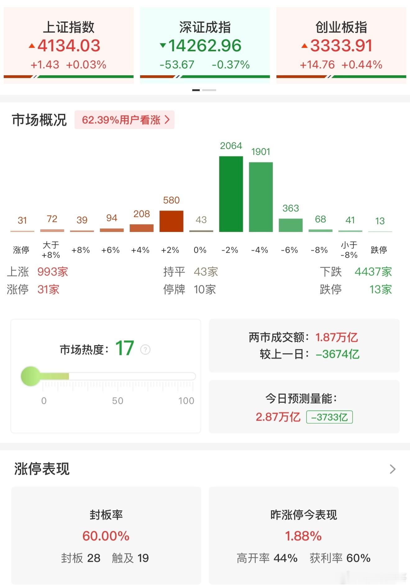 a股 【午评:创业板指探底回升涨0.44% 全市场超4400只个股下跌】1月27日,市场早盘探底回升,创业板指震荡翻红,此前一度跌超1%。沪深两市半日成交额1.87万亿,较上个交易日缩量3674亿。全市场超4400只个股下跌。从板块来看,贵金属概念延续强势,中国黄金3连板,湖南黄金2连板。半导体设备股震荡反弹,芯源微涨近14%,亚翔集成、圣晖集成涨停。CPO概念表现活跃,源杰科技涨超10%创历史新高,汇绿生态涨停。超硬材料概念走强,黄河旋风涨停。下跌方面,电池产业链集体下挫,天际股份触及跌停。截至收盘,沪指涨0.03%,深成指跌0.37%,创业板指涨0.44%。