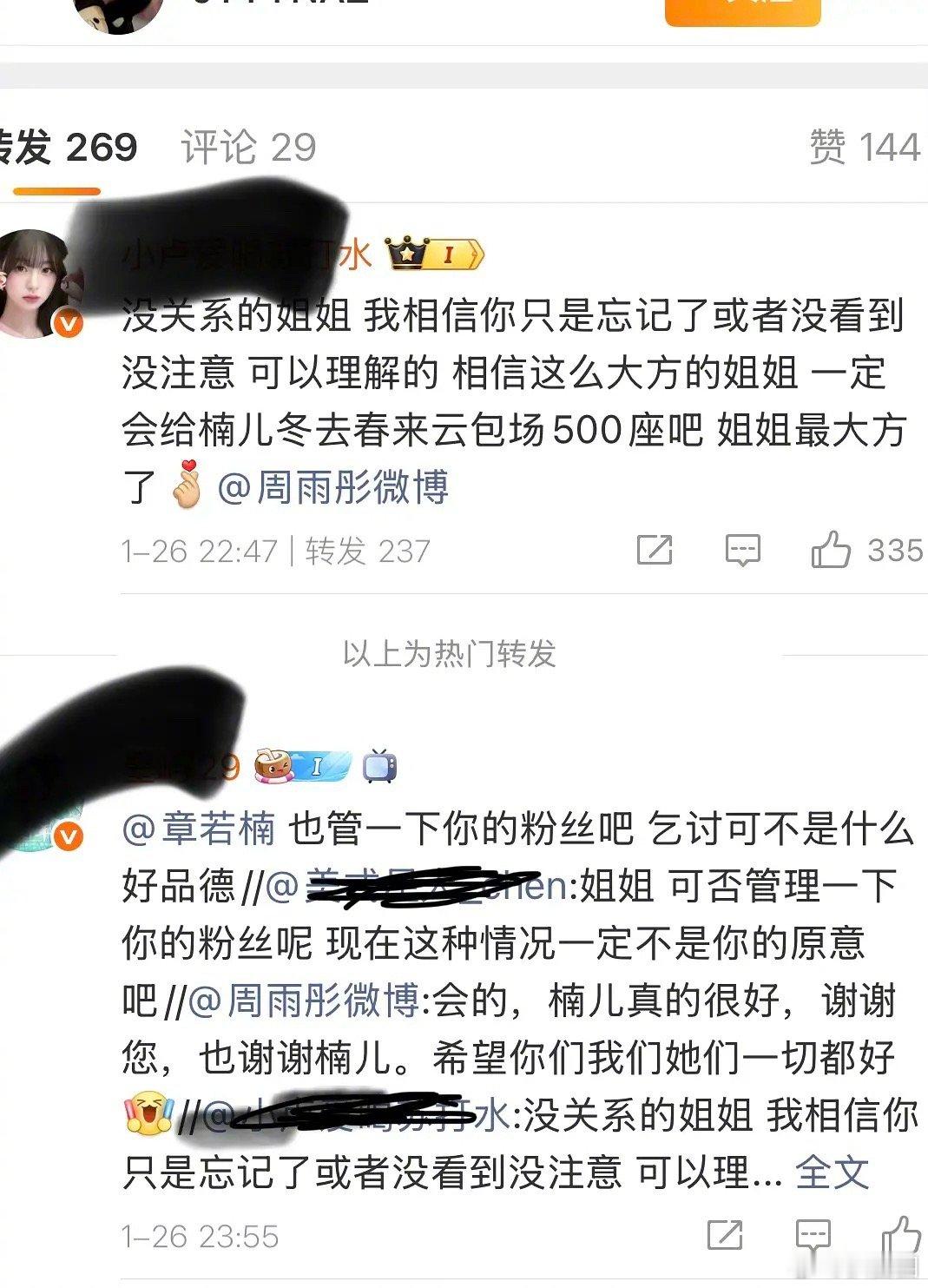 之前周雨彤感谢了其他人的云包场,唯独漏掉了章若楠,后续章若楠粉丝点出来,周雨彤亲自回复章若楠粉丝了~