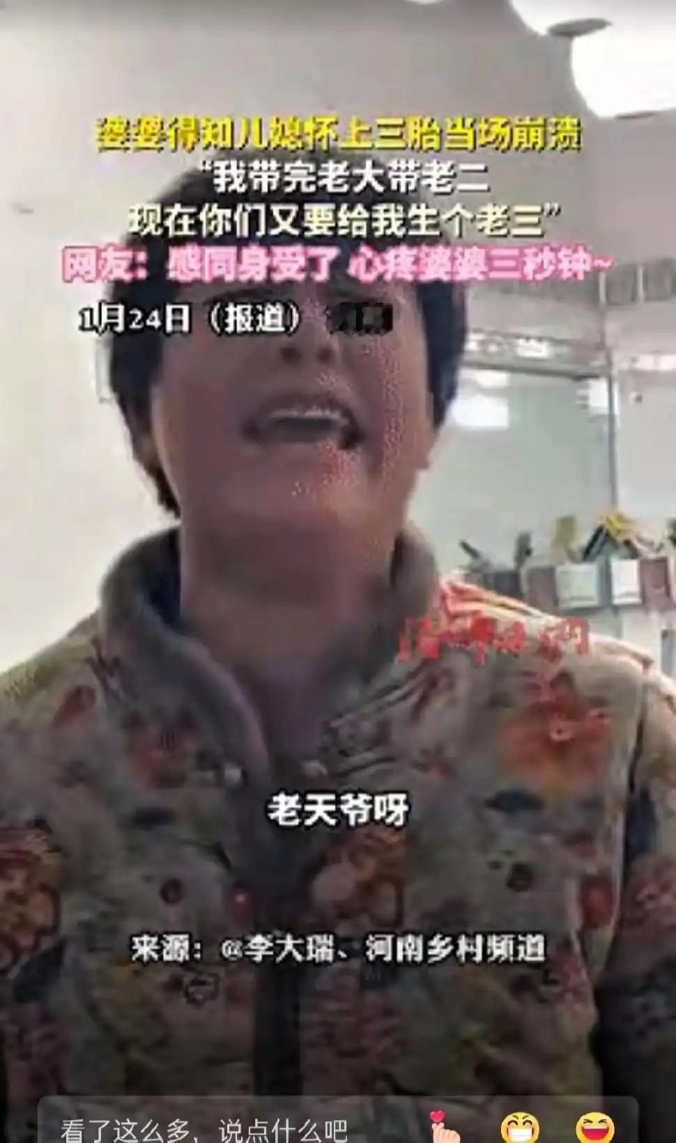 这下真笑不出来了!河南,女子怀上了第三胎,本来是高高兴兴地想着和婆婆分享这个好消息,结果没想到婆婆的反应直接让气氛变得僵硬。女子满脸笑容地告诉婆婆:“我要有三胎了!”谁知道婆婆听了后直接崩溃了,开始坐在那边哭,还念叨着:“老天爷呀,带了两个孩子,现在又来一个!我还活不活了!” 家里监控显示,当时女子告知这个消息时,脸上的笑容都止不住,本以为会迎来祝福和欢笑,没想到婆婆听后当场崩溃,坐在椅子上边哭边念叨 婆婆的情绪真的是瞬间爆发。她并不是高兴,也不是生气,而是满脸的无奈和疲惫。她说自己从16年开始带孩子,十年如一日,从第一个孩子的奶粉到二胎上学送送接接,她几乎从没停下过。这下又多了个孩子要带,她真的是心有余而力不足。她的话让人听了不仅觉得心酸,更能感受到那种“每一滴汗水都没被看见”的委屈 我觉得,儿媳分享喜悦的心情完全可以理解,新生命的到来总是充满希望。但婆婆的反应,恰恰暴露了多子女家庭中常常被忽略的现实:生娃不只是添双筷子,背后是巨大的人力投入和时间成本 在很多双职工家庭中,老人已经成为带娃的主力军。他们放弃了退休后的清闲,重新上岗,这份付出常常被视为“理所应当”,却很少被认真计算和感激。当第三胎的消息来临,婆婆积压多年的疲惫终于爆发,这不是对孙辈的不爱,而是对自己被耗尽的生活的一声叹息 归根结底,家长与长辈之间最好能多沟通一些,不仅是分享喜悦,也要分享负担,理解彼此的难处。大家都在同一个屋檐下生活,不仅仅是靠传统的责任分担,更多的是互相理解和支持
