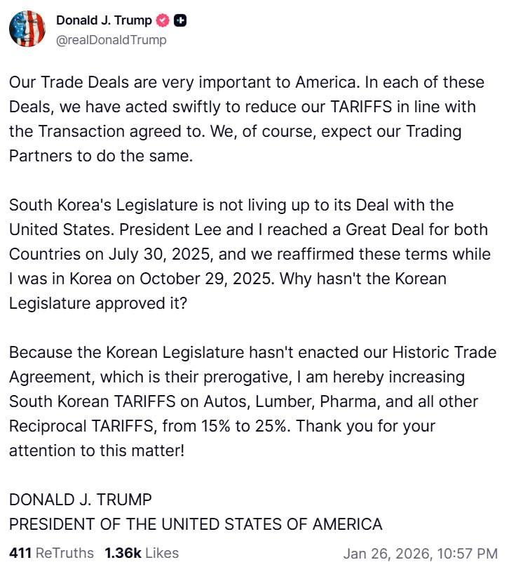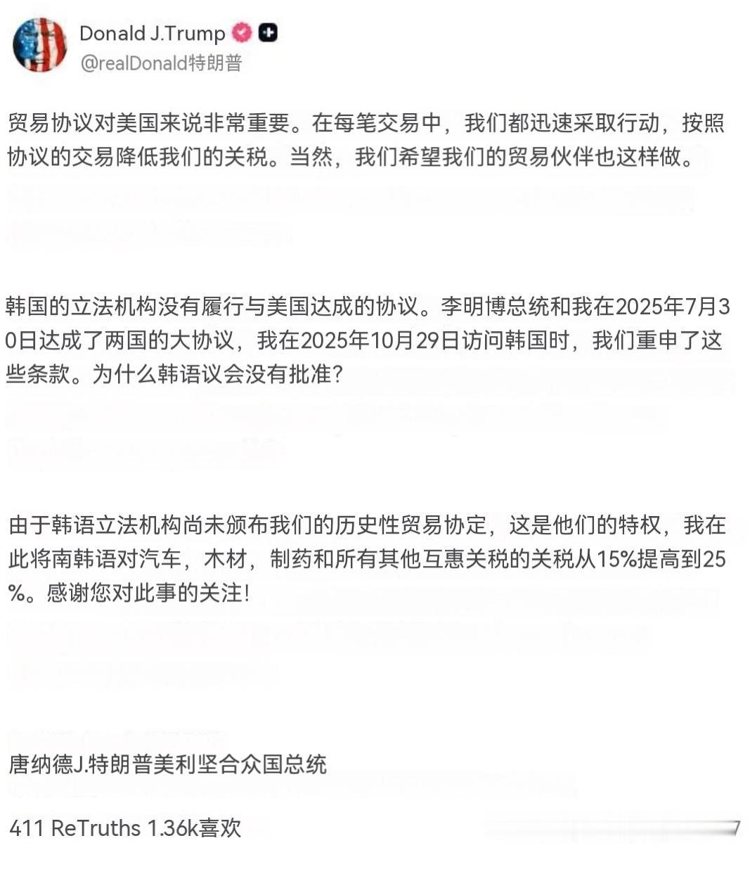 特朗普宣布,由于韩国立法机构未能批准两国贸易协议,美国将把对韩国商品的关税从15%提高至25%。我们的贸易协议对美国至关重要。在每一项协议中,我们都迅速按照达成的交易降低了关税。我们当然期望我们的贸易伙伴也能做到这一点。韩国立法机构没有履行与美国达成的协议。李总统和我于2025年7月30日为两国达成了一个伟大的协议,并在我2025年10月29日访问韩国期间重申了这些条款。为什么韩国立法机构没有批准它呢?由于韩国立法机构没有颁布我们的历史性贸易协议——尽管这是他们的特权——我特此将韩国汽车、木材、制药和所有其他互惠关税从15%提高至25%。关税大棒 对于这些小国百试百灵海外新鲜事热点现场国际局势