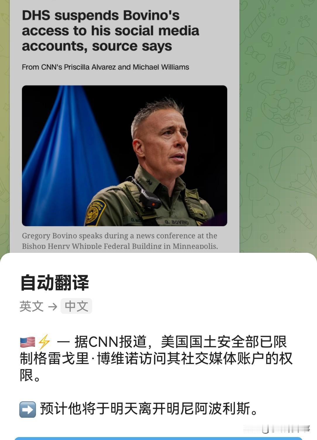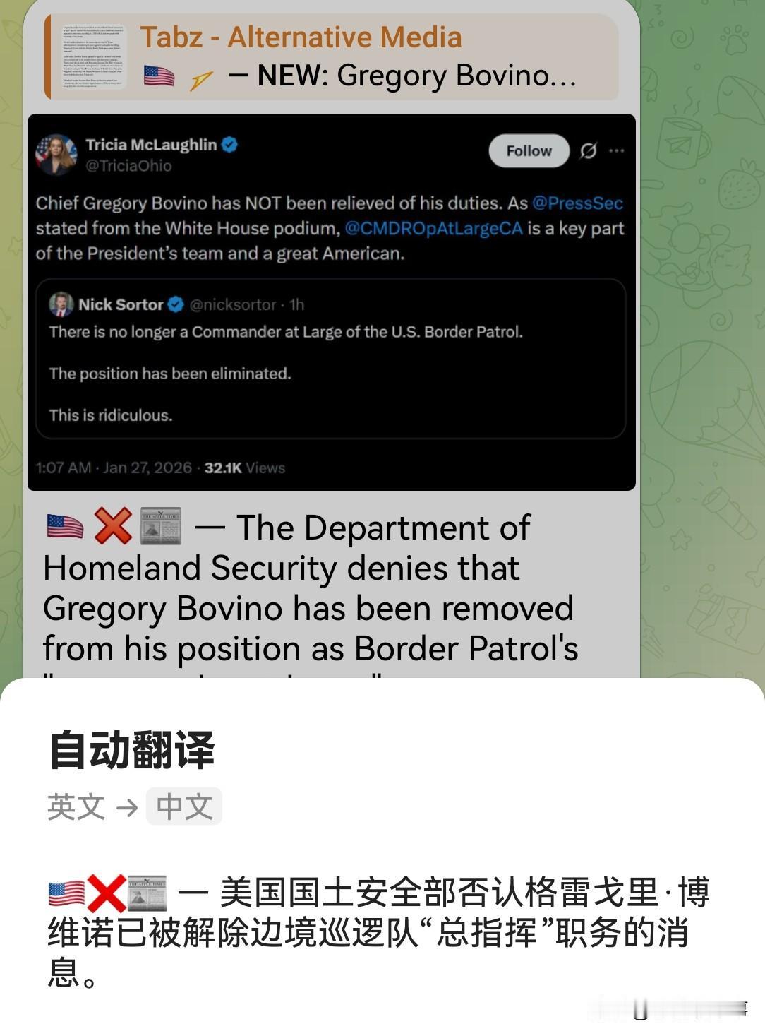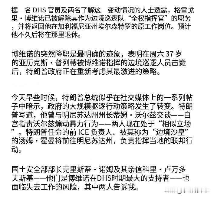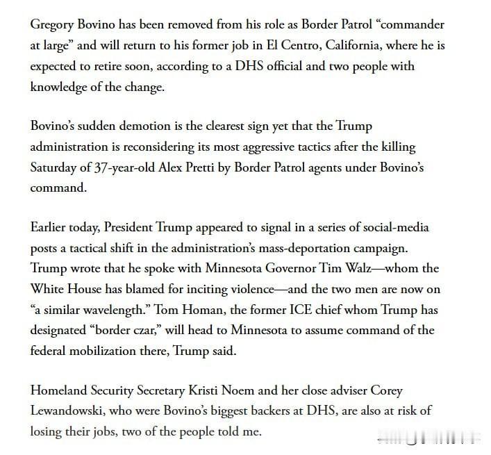 据悉,在37岁美国公民亚历克斯·普雷蒂被枪杀的事情之后,美国边境巡逻队指挥官格雷戈里·博维诺和一些特工将于1月27日(今天)离开明尼阿波利斯市,返回加利福利亚州执行任务。预计他将在不久后退休。 至于博维诺的职务,有些媒体称已被免职,美国国土安全部则予以否认(图四)。