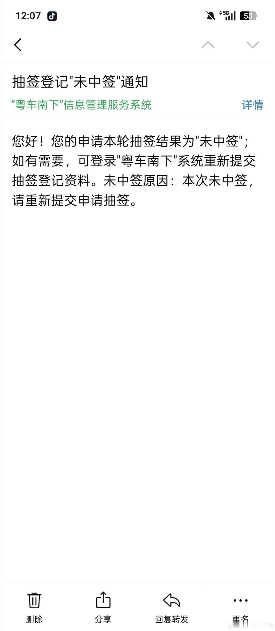 5分之一几率,没有中!我是公司第一个,粤车南下没有中签的!