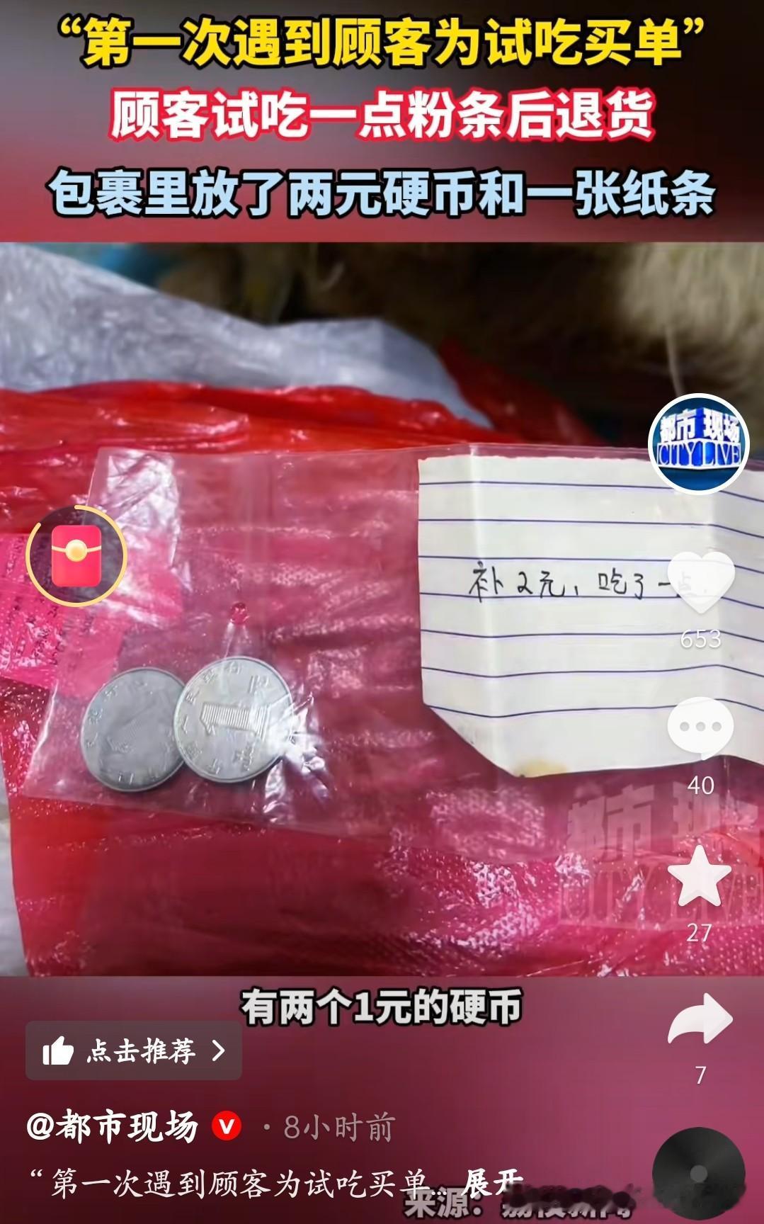买了包粉条,试吃了一点后申请退货,不仅把剩下的寄回来,还特意放了两块钱和一张纸条,说“补2元,吃了一点”。 商家说这是第一次遇到有人为试吃买单,瞬间就被暖到了。这两块钱不多,但这份自觉和真诚,比啥都金贵。在大家都吐槽网购套路的今天,这种互相体谅的善意,真的能让人心里一热。