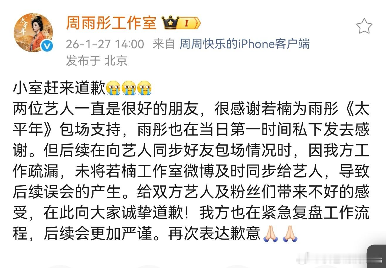 周雨彤方道歉 章若楠为周雨彤包场,周雨彤方因工作疏忽未将章若楠工作室微博同步艺人,周雨彤方现在为此事道歉。