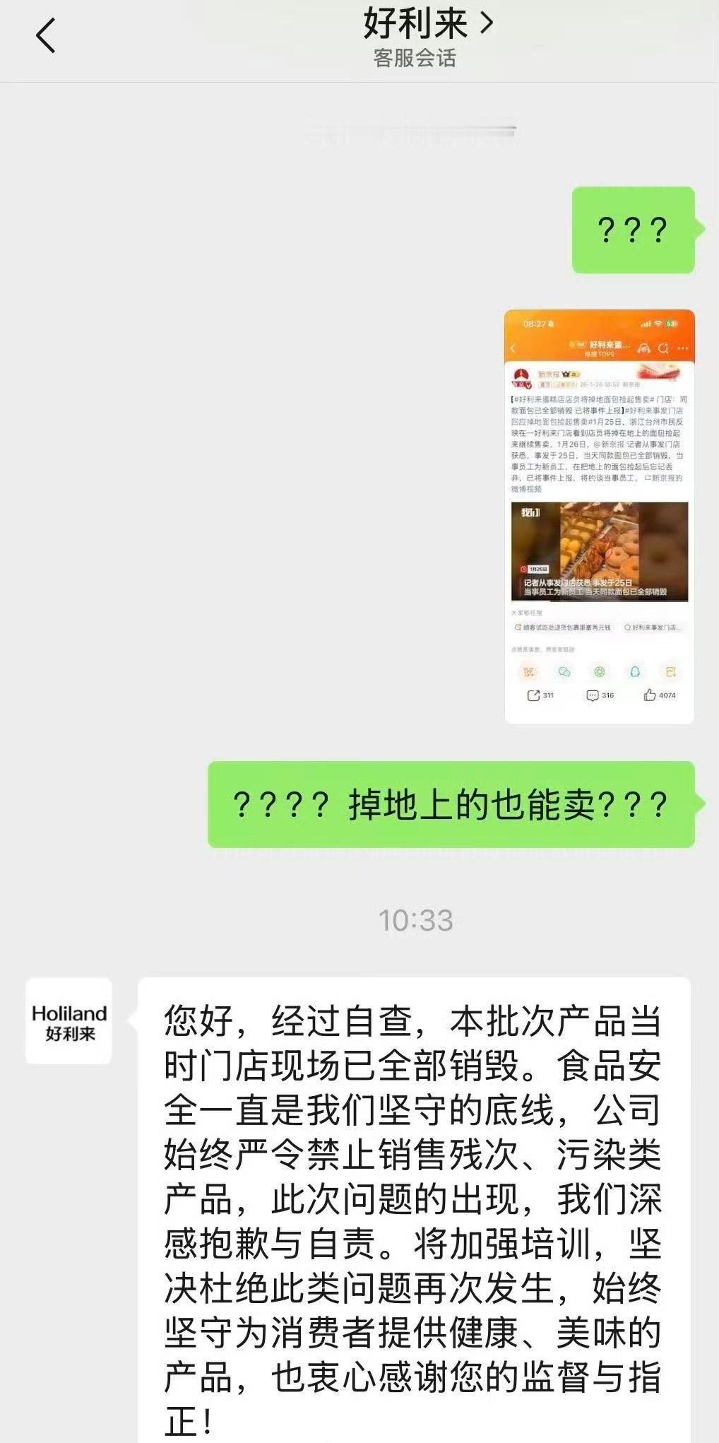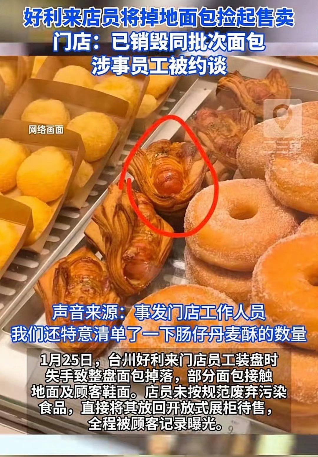 1月25日,浙江台州好利来门店内,店员在搬运面包时整盘掉落,部分面包直接接触地面,甚至碰到顾客鞋面。随后,涉事店员当着顾客的面,将掉落的面包捡起后直接放回开放式展柜,整个过程被顾客拍摄曝光。随后,该门店解释称,当事员工为新员工,捡起后忘记丢弃。好利来道歉称,门店当天同款面包已全部销毁,已约谈当事员工。好利来道歉时事满谈如果是消费者已购买,自己不小心掉地下,看个人意愿,可以选择扔掉不要,也可以捡起来视情况而定,但这个动作不能是门店员工来做,还有顾客在场情况下,可想而知,好利来或其他食品类门店,员工遇到食品掉落地面,在没第三人在的情况下,大概率都会捡起来继续售卖。对此,只能是“眼不见为净”,早年我在西安飞鸿肉夹馍一门店就餐,就在肉夹馍里吃出了苍蝇,店内员工年纪比较大,随口跟我说,那没啥的,自己家里做饭发现苍蝇,也拿出来继续吃(详情见:网页链接)。不浪费粮食是好习惯,但得具体分情况,尤其是对外经营的消费场景,起码当着顾客面,得把卫生工作做好。近年来,好利来各地门店多次因卫生问题被投诉。2024年12月,南京门店面包上出现苍蝇,店员仅将苍蝇赶走;2025年5月,宁波门店试吃盒内发现苍蝇;2025年7月,北京消费者投诉儿童蛋糕吃出塑料片。更早一些的2023年,杭州、大连、成都等多地门店被曝有飞虫、虫子尸体等问题。好利来的高端品牌形象,面包的高溢价,不是只靠包装和营销堆砌,更需要建立在基础操作规范上,在我看来,捡起掉地上的食物直接扔掉,属于最基本常识,用“新员工疏忽”解释太过牵强,折射出好利来日常管理的粗暴,类似问题后续还会有。好利来道歉