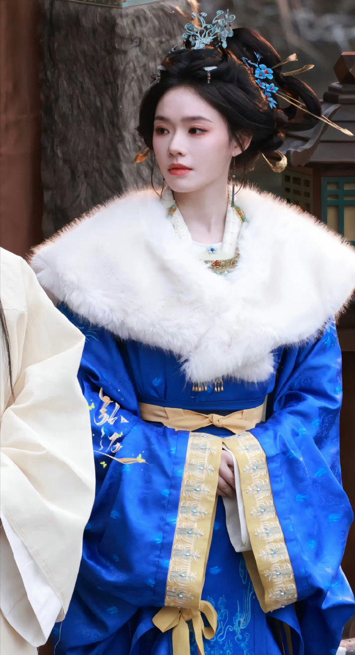 林允归鸾蓝衣白毛领造型林允归鸾蓝衣狐裘金发簪林允归鸾蓝衣白毛领造型,林允归鸾