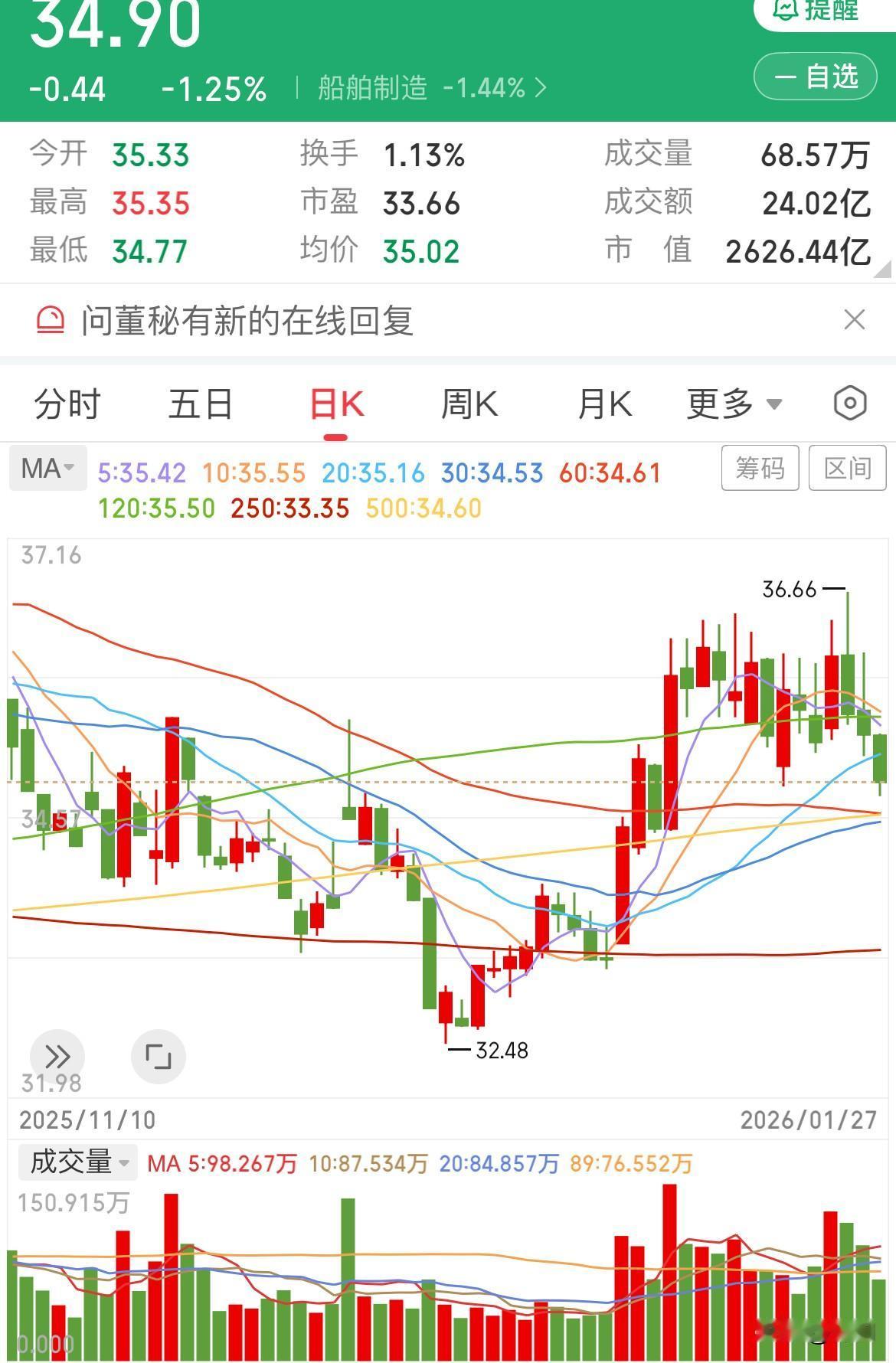 船舶究竟会调整到何处 今日,船舶延续昨日跌势,并未如预期般止跌。不过,仍能看到一些积极信号。其一,主力资金持续流入,这表明机构抛售较少,此次下跌主要是散户卖出所导致。其二,今日收盘价高于1月19日的最低点,守住了34.8的支撑位。 因此,若明日继续顺势下跌,且在30日线以上获得支撑,这将是一个短线机会。今年以来,其走势比去年下半年要强得多,跌幅可控,成交较为活跃,人气也有所提升。在此处下跌时都有抵抗,这是船舶ETF建仓所致。 明日需密切关注34.45的支撑位,若该支撑位不破,则表明此次下跌即将结束,后续将迎来反弹。 当前,我们要做的就是坚定地捂紧筹码。 船舶 船舶行情 船舶行业 船舶走势 中国船舶