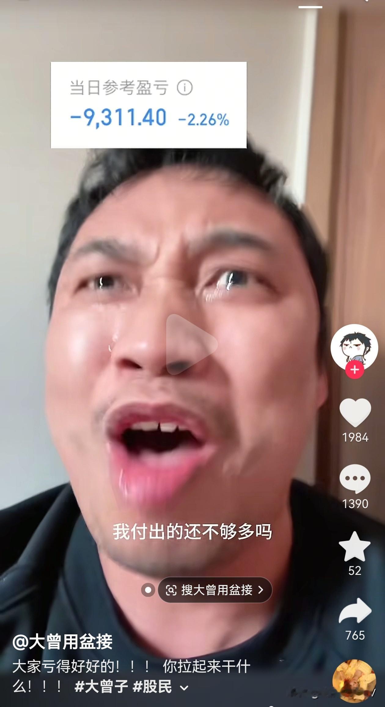 哈哈哈!大曾子今天亏的不开心了!上午他还发视频说大家都亏就是赚,结果下午指数拉起来了,他又发视频说现在只亏他的,他表示不开心,他希望大家跟他一起亏,自己亏钱算什么? 今天应该不只大曾子亏钱吧!大部分人都是亏钱的,一共三千多家下跌的,上涨的也是少数,这行情赚钱太难了[捂脸]大曾子