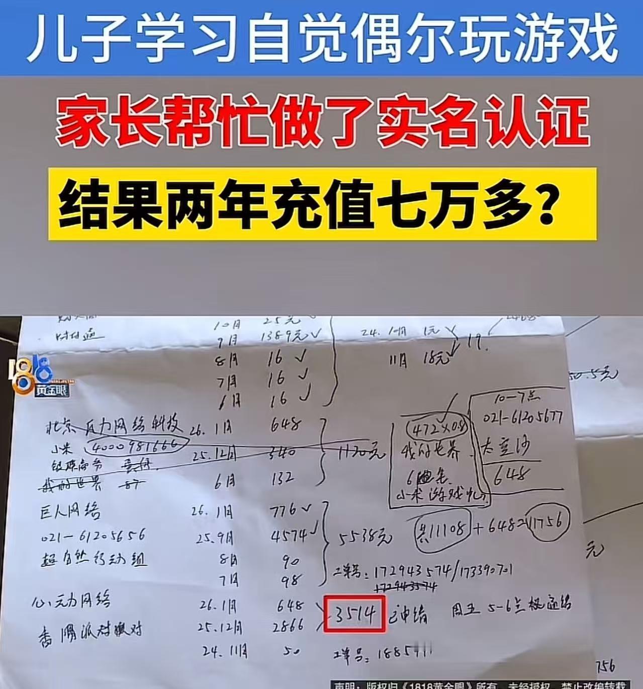 “孩子两年偷偷充值7万,妈妈竟毫不知情!”杭州13岁男孩用母亲手机狂氪游戏,家长怒求退款,平台却质疑:“凌晨还在充钱?真是孩子操作的吗?”网友:两年了才知道,现在出来要退钱,以后所有人都这样好了? 杭州拱墅区的黄女士最近差点晕过去——她翻看银行卡流水时,赫然发现短短两年间,近7万元不翼而飞! 更让她崩溃的是,这笔钱全被13岁的儿子悄悄充值进了近10款热门手游,光2026年元旦那几天,就一口气刷了4万多! “我完全不知道啊!”黄女士又急又悔,“他平时学习很自觉,作业一写完我就让他自由安排时间,玩会儿游戏我也觉得没问题……” 问题出在“认证”环节。当初游戏开启“未成年人防沉迷系统”,要求实名认证。 儿子拿手机给她:“妈,帮我点一下认证。” 黄女士没多想,直接用自己的身份证完成了人脸识别——她以为只有成年人才能认证,根本不知道孩子也能用自己证件注册。 从此,这台本该用于“查资料、联系同学”的手机,成了孩子的“氪金终端”。 而黄女士的支付密码,也在日常购物中被儿子悄悄记下。 “问他知不知道刷的是妈妈的钱,他摇头说‘不知道’……他对钱根本没概念。”黄女士哽咽道。 如今,她向多家游戏公司申请退款,却遭遇重重阻力。 以腾讯为例,客服回复称:“用户申报的消费金额与后台记录存在较大出入;且部分充值发生在凌晨2-4点,与低龄未成年人正常作息严重不符。结合消费周期长、涉及游戏多等特点,需谨慎评估是否确为未成年人操作。” 言下之意:一个13岁孩子,怎么可能半夜不睡觉连续氪金?怕不是家长事后反悔,想白嫖游戏道具? 尽管黄女士后续补交了银行流水、亲子关系证明等材料,金额也已核对一致,但退款流程仍卡在“审核中”。 网友激烈争论:谁该为这7万块买单? “两年了才发现?孩子都充到第10款游戏了!当妈的真这么心大?现在出来要退钱,以后人人都学——先让孩子玩,花完再哭穷退钱!” “凌晨充值怎么了?孩子熬夜打游戏太常见了!我家邻居小孩天天通宵,家长还以为他在‘学习’!” “关键不是退不退,而是为什么一个13岁孩子能绕过所有防沉迷限制?人脸识别是摆设吗?支付验证形同虚设!” 也有家长共鸣:“我们不是不管,是防不胜防!孩子用你的脸认证,记你的密码,你一转身他就充几百——这到底是家庭教育问题,还是平台把漏洞当商机?” 我认为,这7万元,照出的不是“熊孩子乱花钱”,而是整个未成年人网络保护体系的集体溃败。 一边是家长疏于监管,把手机当“电子保姆”;一边是游戏公司嘴上喊“防沉迷”,背地里却用皮肤、抽卡、限时礼包精准狙击未成年人心理弱点;而所谓“人脸识别”“限时一小时”,在共享设备、成人代认证、支付无二次验证的现实面前,脆弱得像一张纸。 更讽刺的是,当孩子沉迷氪金时,平台沉默;当家长追责退款时,平台却拿出“作息不符”“金额异常”来质疑——仿佛他们不是商业巨头,而是道德侦探。 如果连“母亲人脸认证+孩子操作+两年持续充值”都无法被认定为未成年人消费,那这套防沉迷系统,不过是给监管交差的遮羞布,给家长挖下的责任陷阱。 真正的保护,不是等孩子花光7万才启动审核,而是在登录游戏的时候就人脸识别到底是谁操作?夜间登录就应该有风险提示,第一笔648元充值时,就弹出一句:“您正在为未成年人支付,请确认监护人身份并输入独立支付密码。” 否则,今天哭的是黄女士,明天倒下的,将是更多家庭的信任与底线。 (来源:1818黄金眼