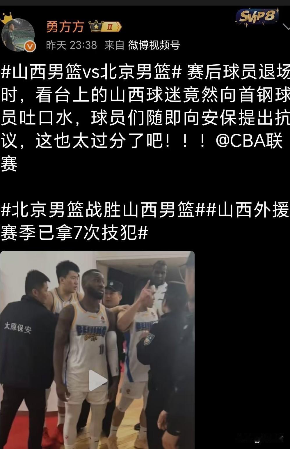 山西球迷,又来了 昨天,山西主场,打北京队,输了,球迷急了,朝着北京队球员吐口水,陈盈俊,杰曼,雷蒙,遭殃了,北京队队员,找保安理论,保安也不知道该怎么办。 大家都觉得,这帮球迷素质真差,山西媒体人侯向锋,估计头都大了,这事没法洗啊,肯定要被骂,CBA公司,估计又要罚款了。 山西球迷,也不是第一次这样了,以前就围堵客队大巴,扔水瓶,输不起,只能赢,一输就闹事,真是没教养,输球又输人,真恶心,所有人都在说。 希望CBA公司这次能严惩,还篮球场一个干净,你对山西球迷,怎么看呢。